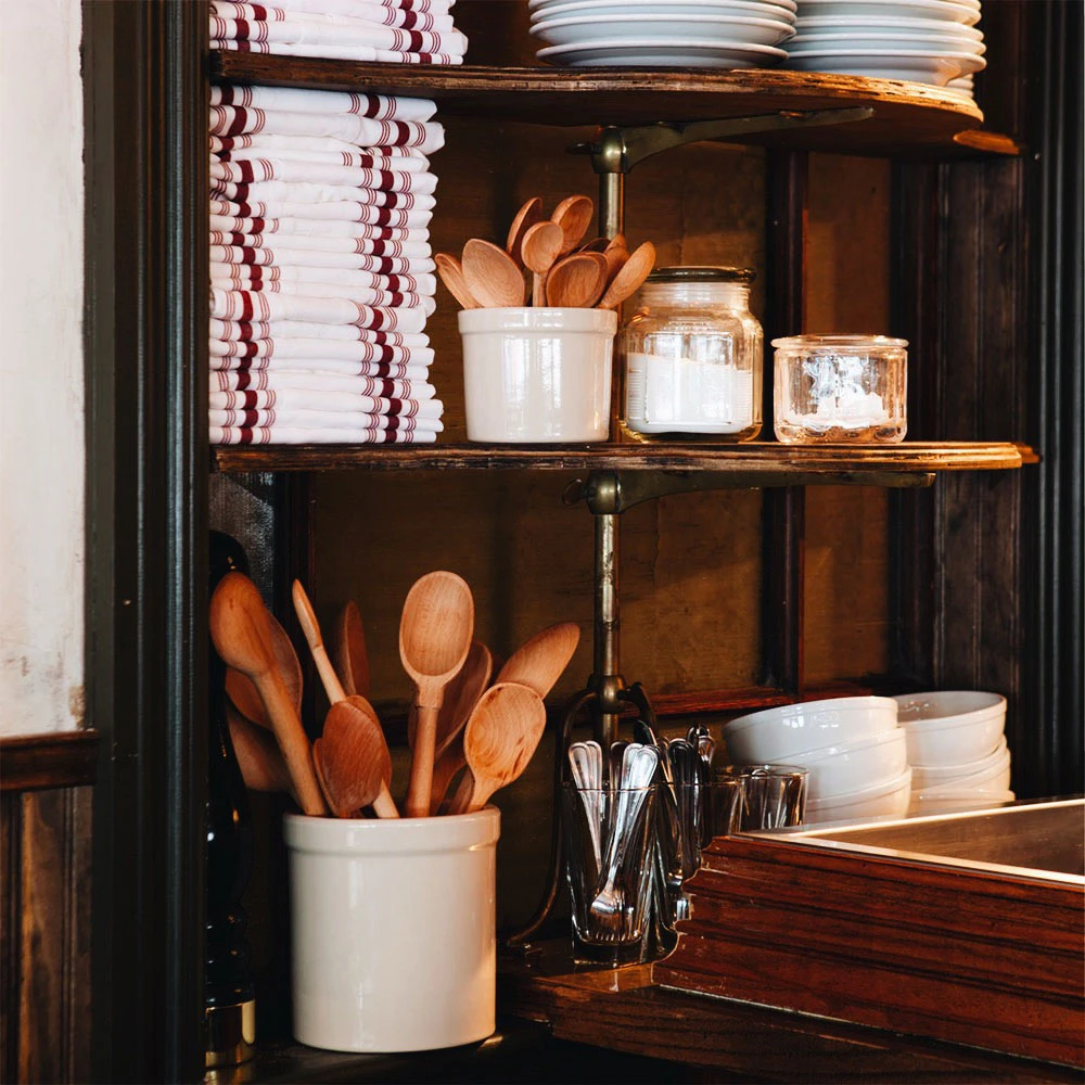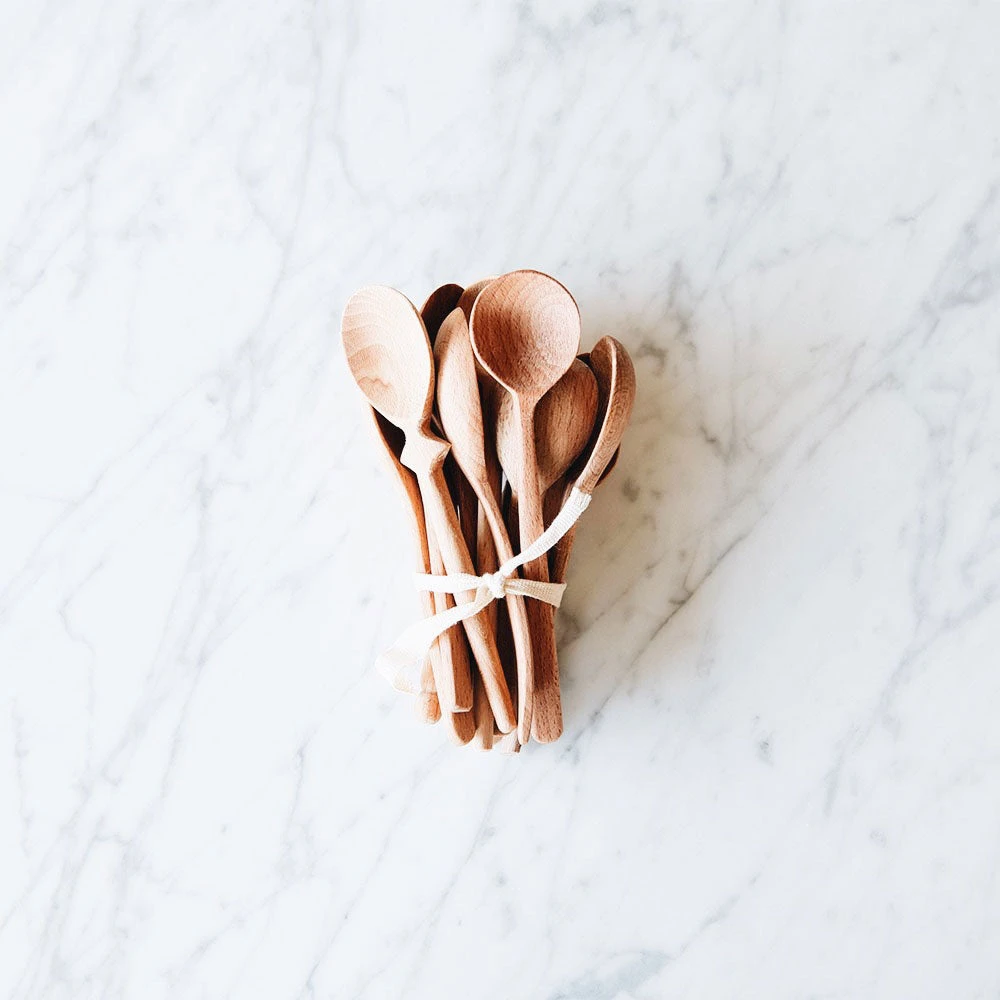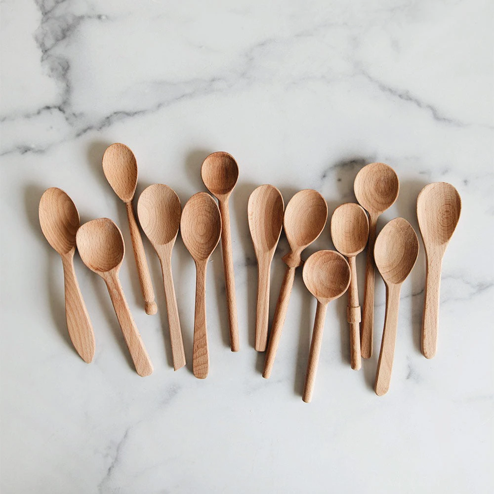 The wooden spoon is a kitchen workhorse, the baker’s dozen wood spoon sets are an instant collection of thirteen assorted styles with no two alike, replicated from favorite vintage styles and sold packaged as a set in a printed muslin pouch. The small spoons are ideal for spices, sauces, and desserts. Each spoon is hand-carved from beautiful beech hardwood, and they gain a warm patina with age and use.