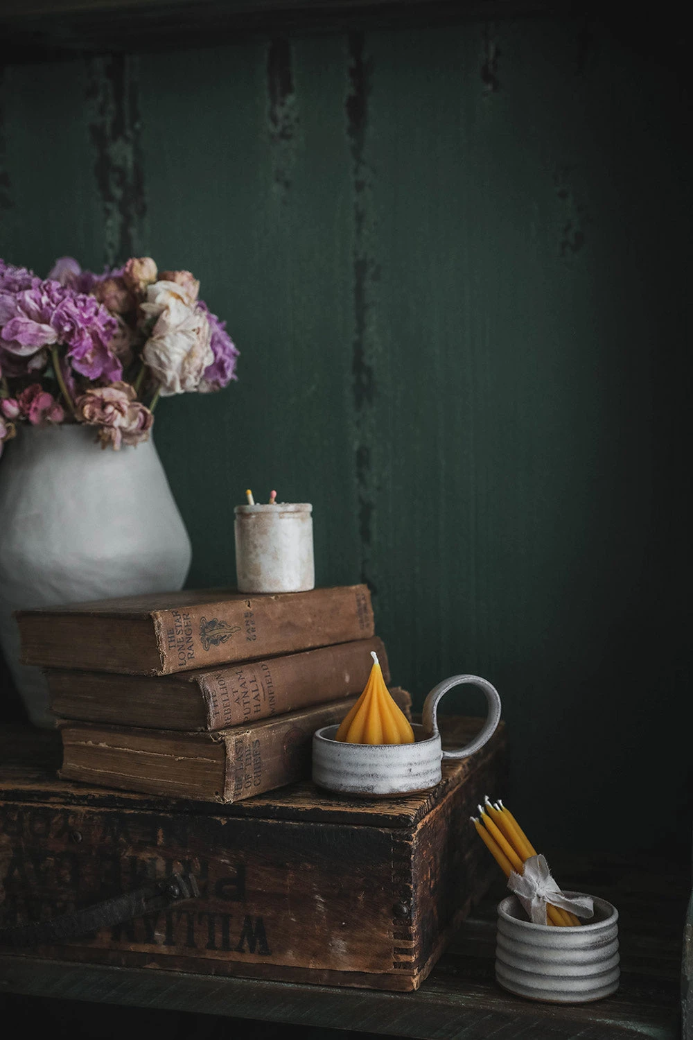 Indulge in the warm and inviting ambiance of these handcrafted molded beeswax candles. Each candle is a work of art, meticulously crafted with pure beeswax to ensure a natural, clean burn. The elegant molded design adds a touch of sophistication to any setting, making these candles perfect for both everyday use and special occasions.Â
