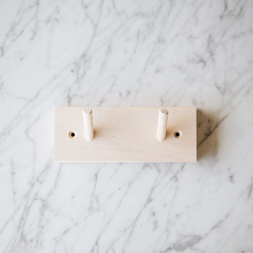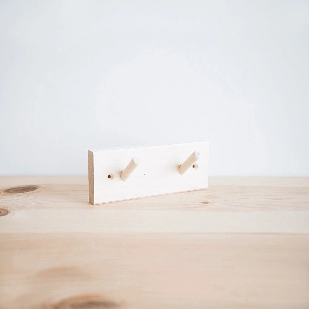 Peg rail rack with 2Â hooks in birch wood. Goes well in the kitchen, hall, bathroom or ANY room! We’re obsessed with these beauties, and for a good reason. The clean lines and super functional design had us from the get-go. Display your most prized pretties or use it to tidy up.