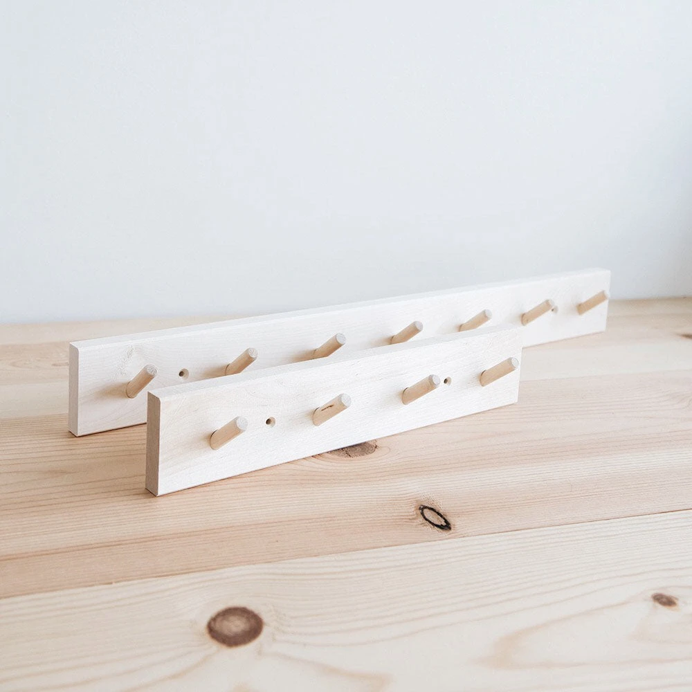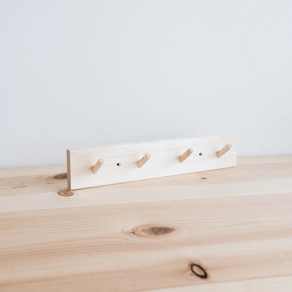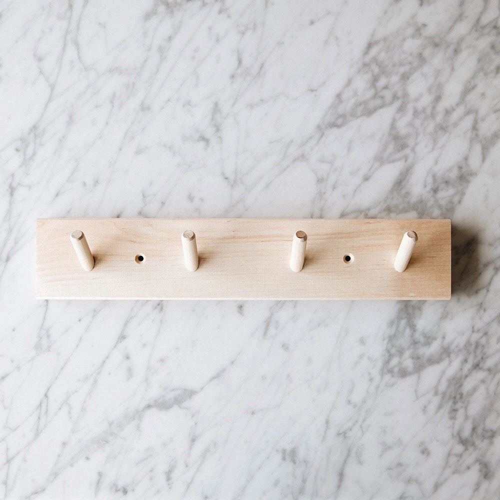 Peg rail rack with 4Â hooks in birch wood. Goes well in the kitchen, hall, bathroom or ANY room! We’re obsessed with these beauties, and for a good reason. The clean lines and super functional design had us from the get-go. Display your most prized pretties or use it to tidy up.