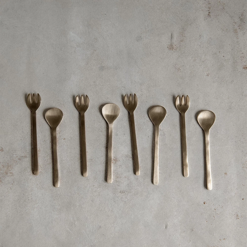 Simplicity at its finest. Hand-hammered in brass, this dessert set is a great option when serving ice cream, pudding, or custards. Use them for chutneys and mustards on your hors d’oeuvre tray too. Irregularities in finish may occur. As each is handmade, surfaces may not be uniform.