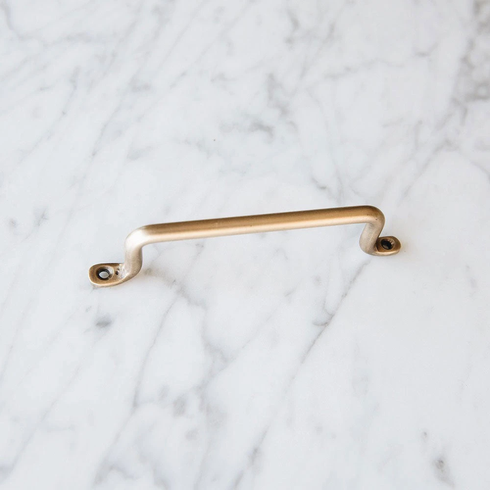 Simplicity at its finest. This beautiful handmade drawer handle is crafted of warm, antiqued brass. Irregularities in finish will occur and bring out its true handmade nature.Â