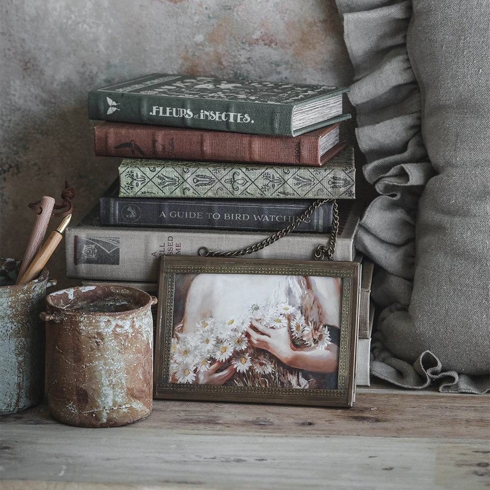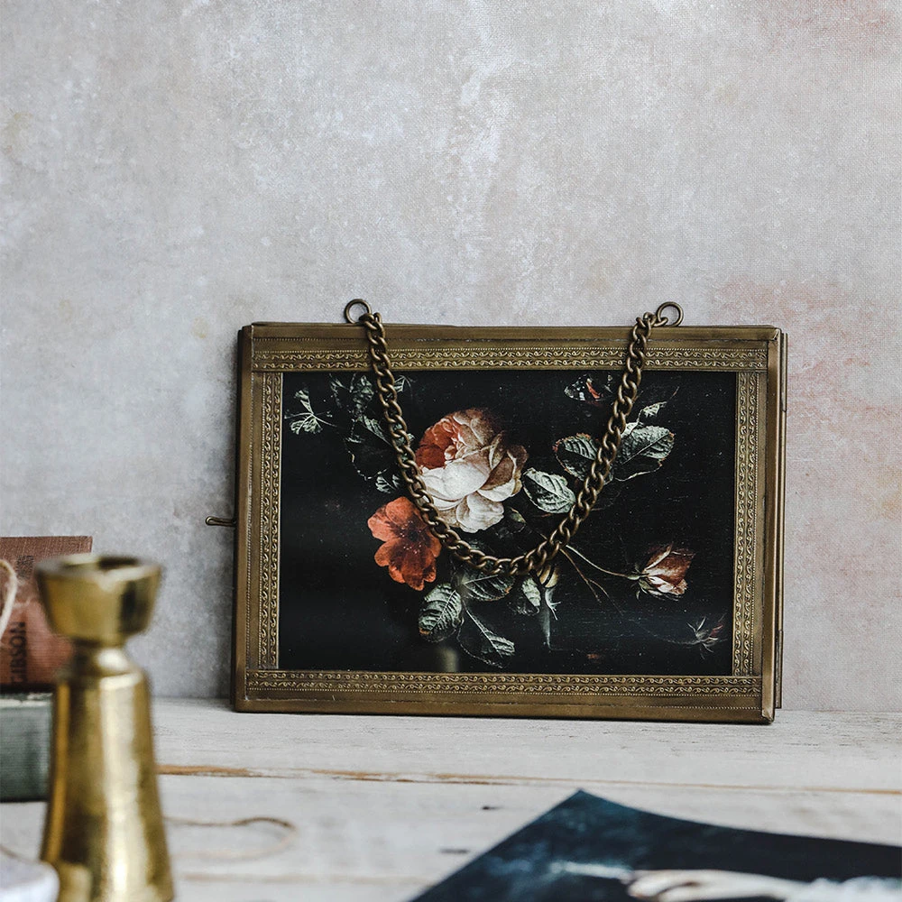 AÂ whimsical textured border on this wall frame crafted from brass and glass. These frames have a hinged opening for easy placement of a photograph or floral for pressing.Â