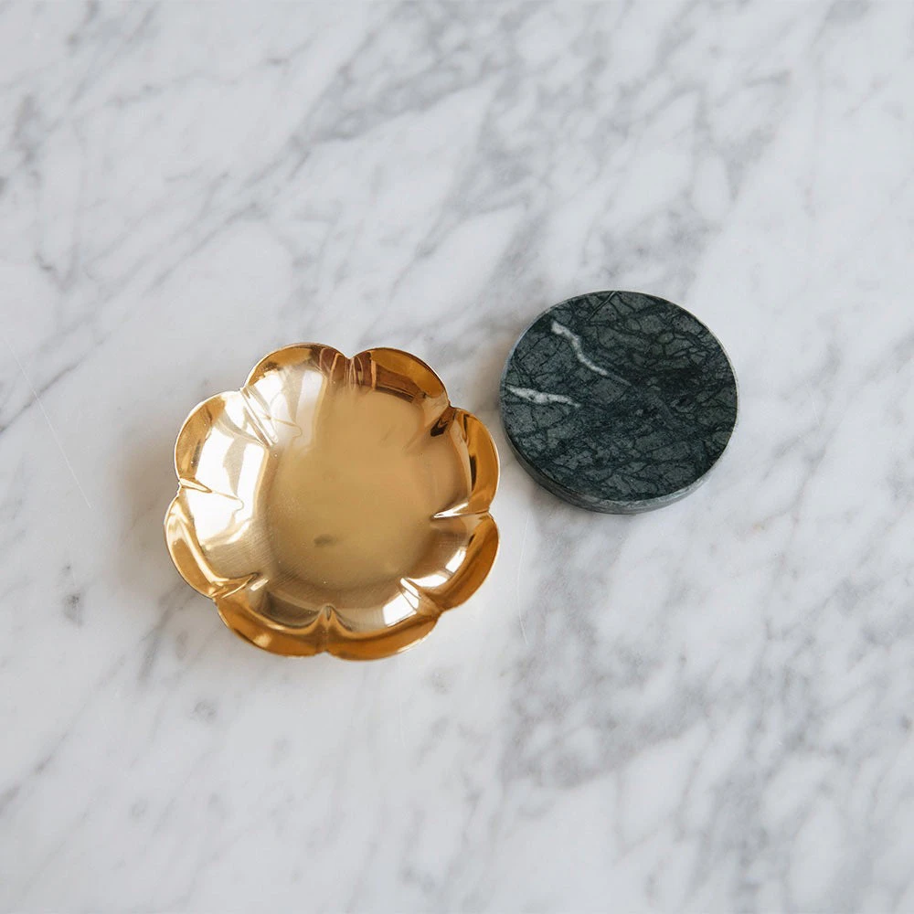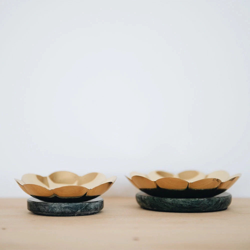 Beautiful petal tray set with a natural green marble base. They are perfect for tealights, jewelry, bits, and bobs. Also a stunning accent on a table or a shelf! Irregularities in finish will occur and bring out its true handmade nature.