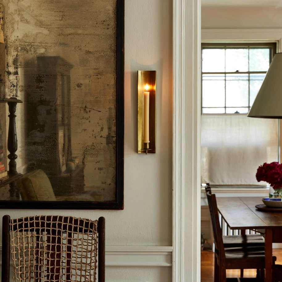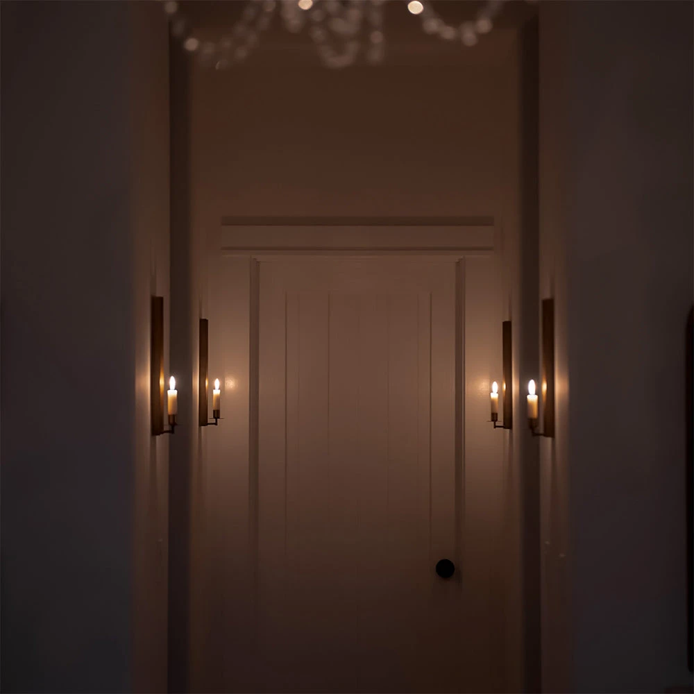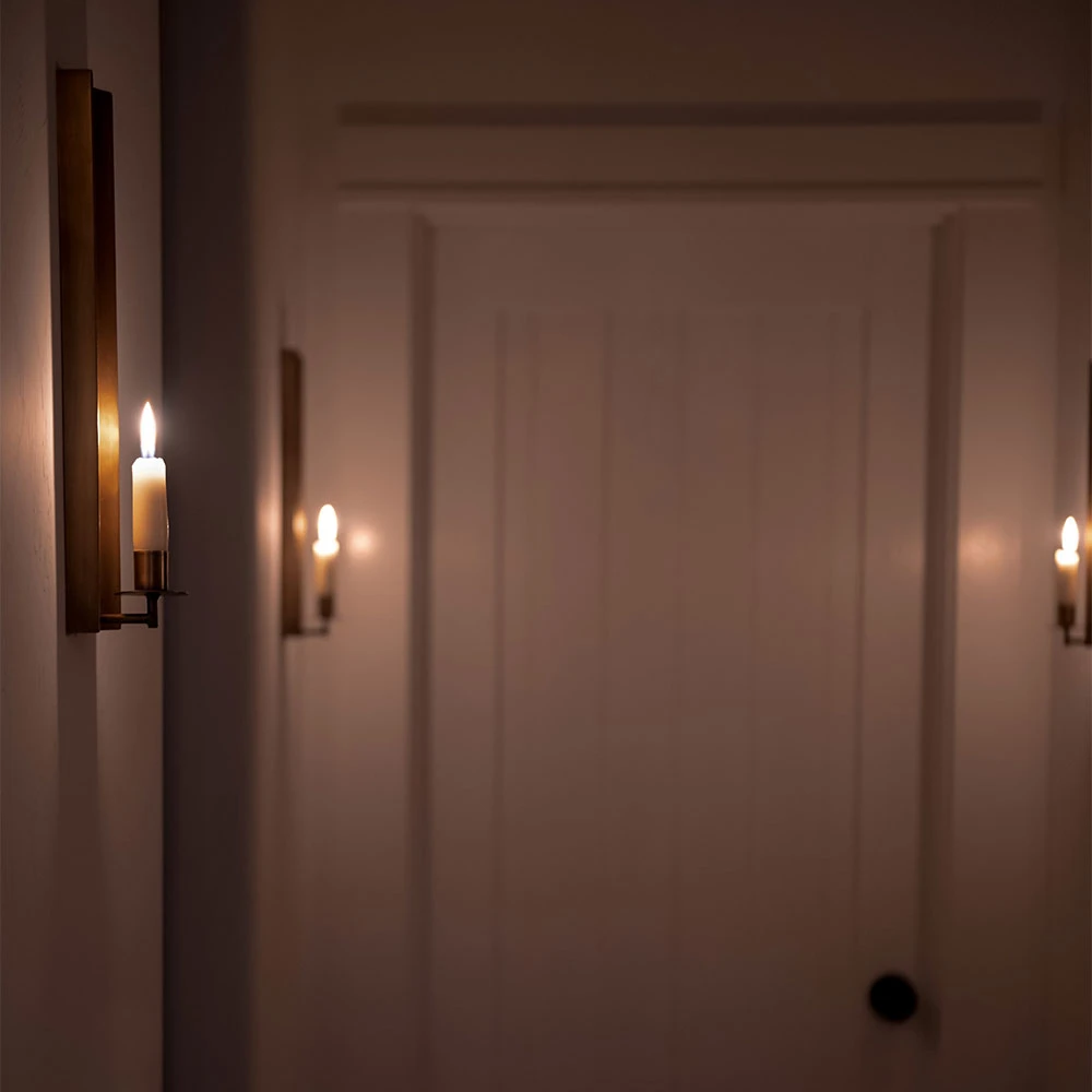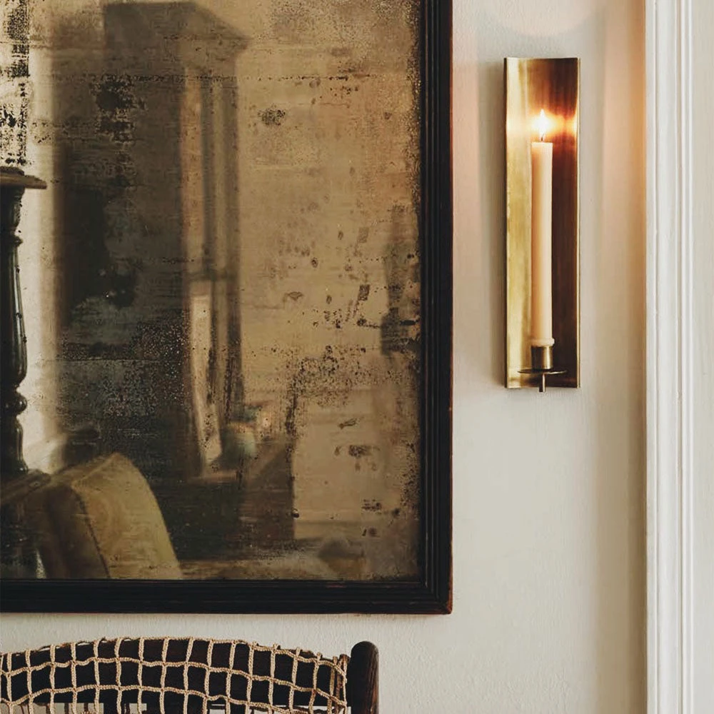 This stunning wall-mounted candle sconce envelopes the flame in a reflective golden glow. Constructed from brass-plated steel sheeting.