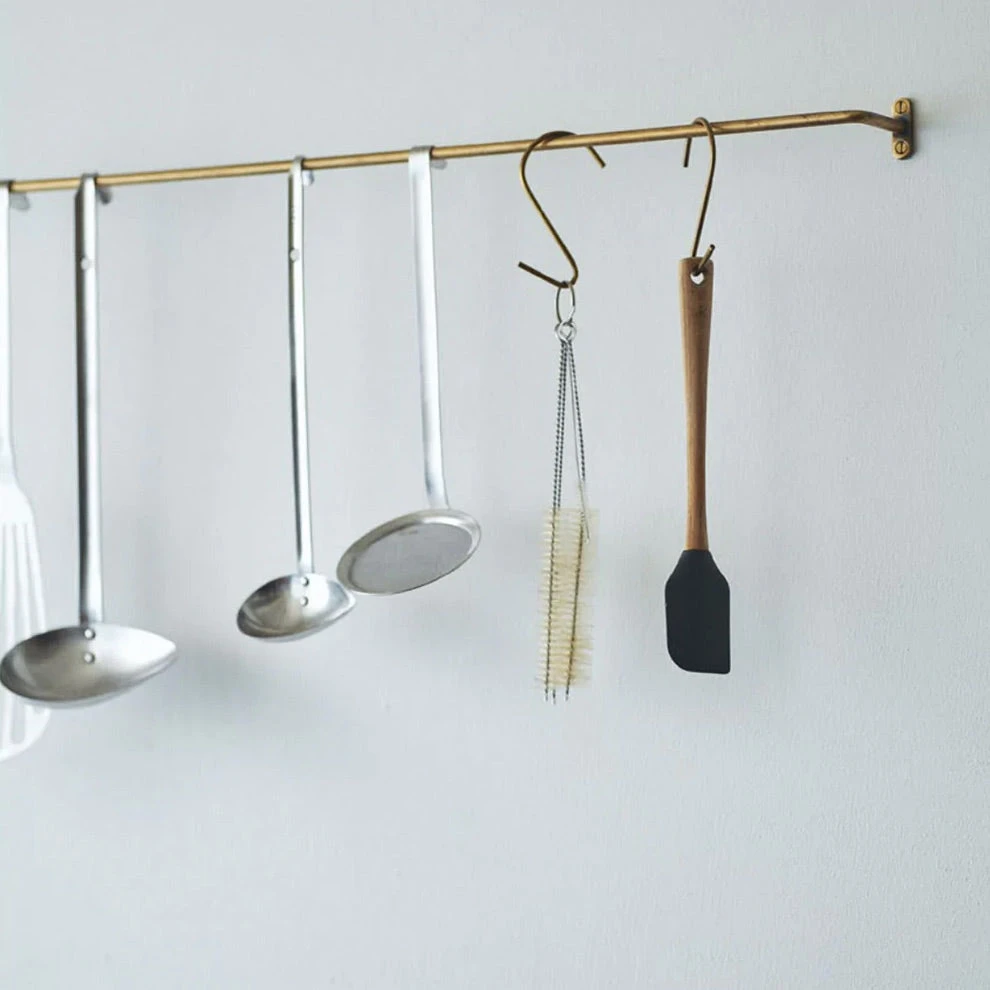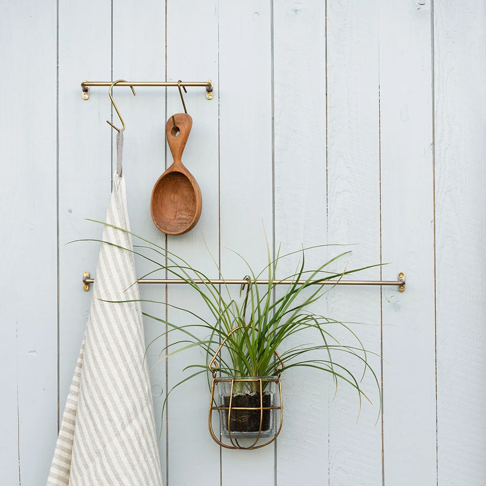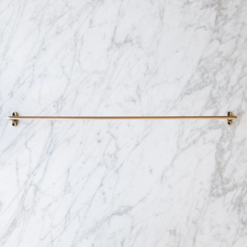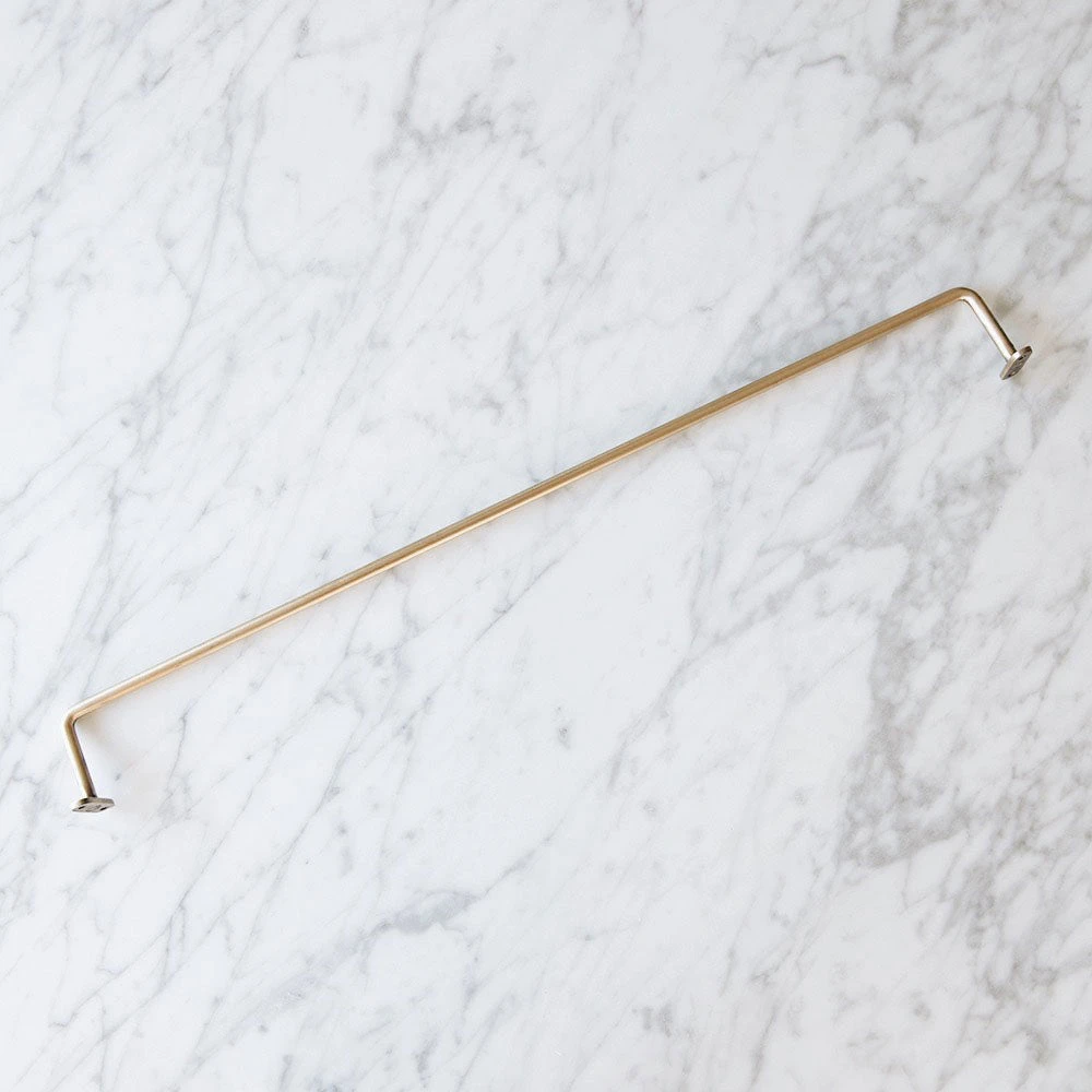 Simplicity at its finest. This beautiful handmade towel bar is crafted of warm, antiqued brass. Irregularities in finish will occur and bring out its true handmade nature. We love them in the kitchen and bathroom.Â