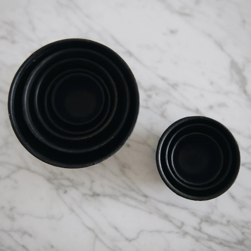 These mini nesting cast iron bowls have uses galore. Great as condiment vessels, salt + pepper dishes, or catchall for change and jewels. Avoid leaving anything acidic in them for extended periods of time.