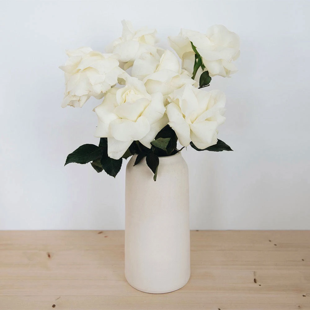 White stoneware lightly glazed clear inside for a smooth feel, contrasting with the roughness of the unglazed clay on the exterior.