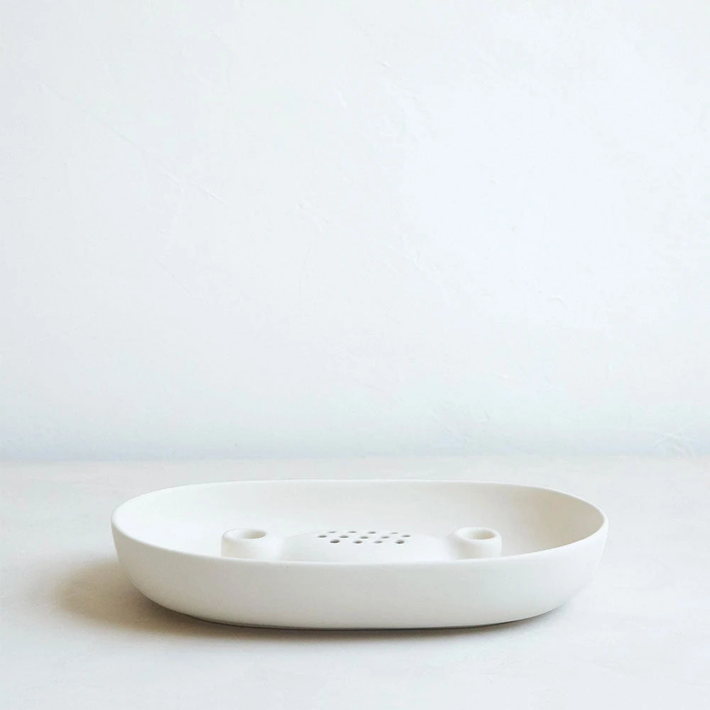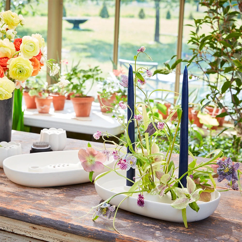 An ideal centerpiece on the dining table or a unique addition to one’s decorative collection, this beauty has holes that can be filled with water to display flowers and the two candleholders hold a standard taper candle.