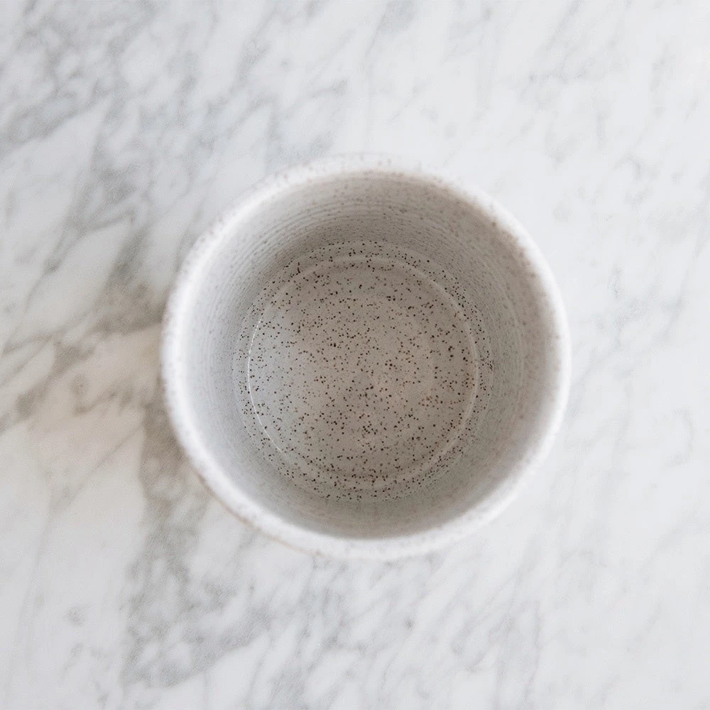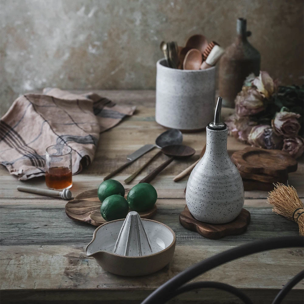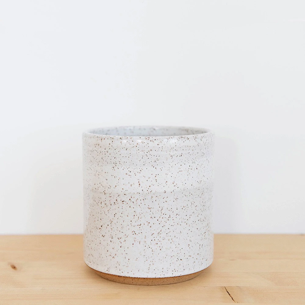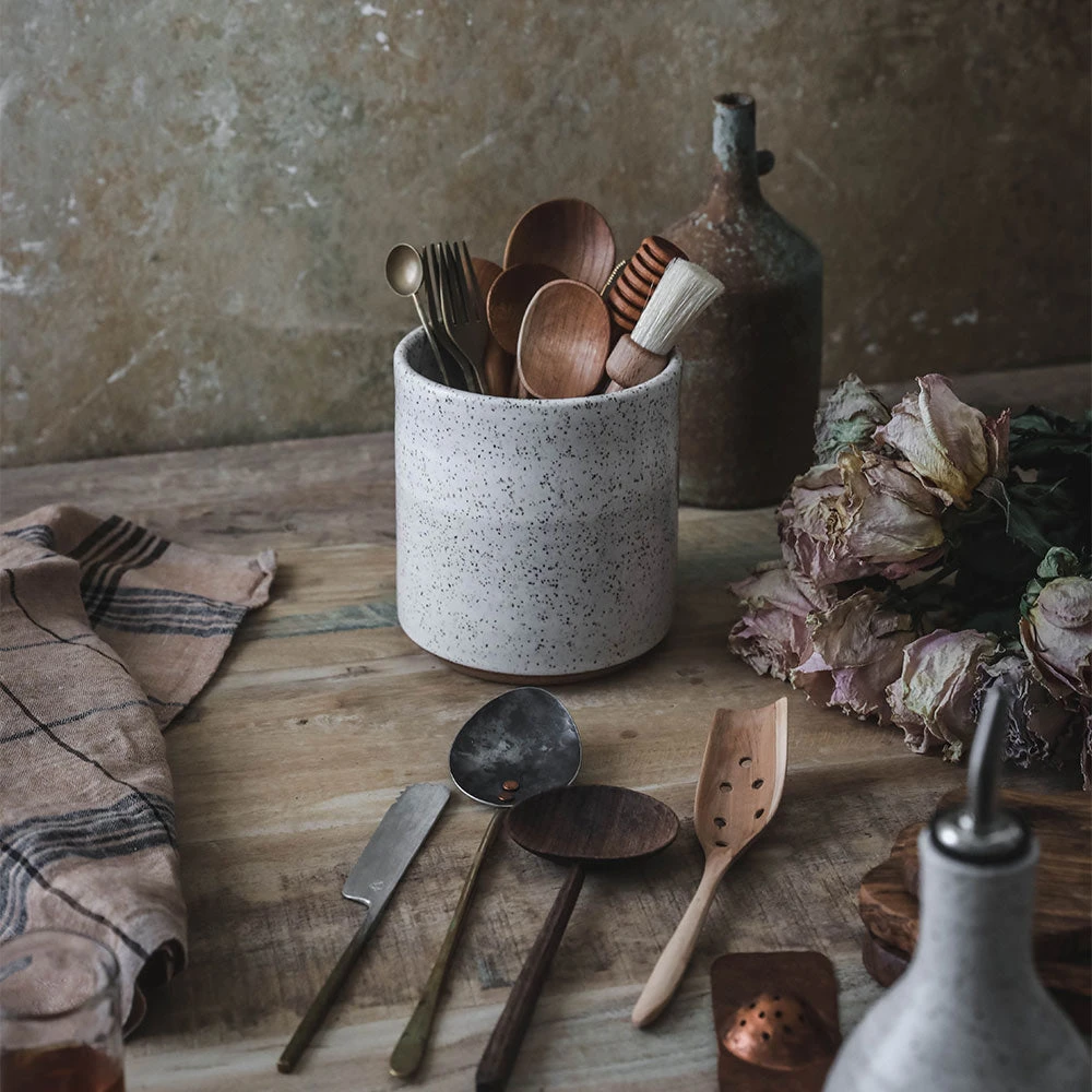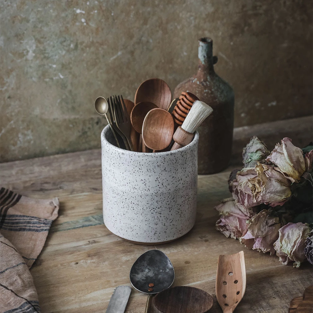 Ceramic kitchen canister with a light-colored speckled finish. The perfect piece for keeping your utensils and spoons organized.