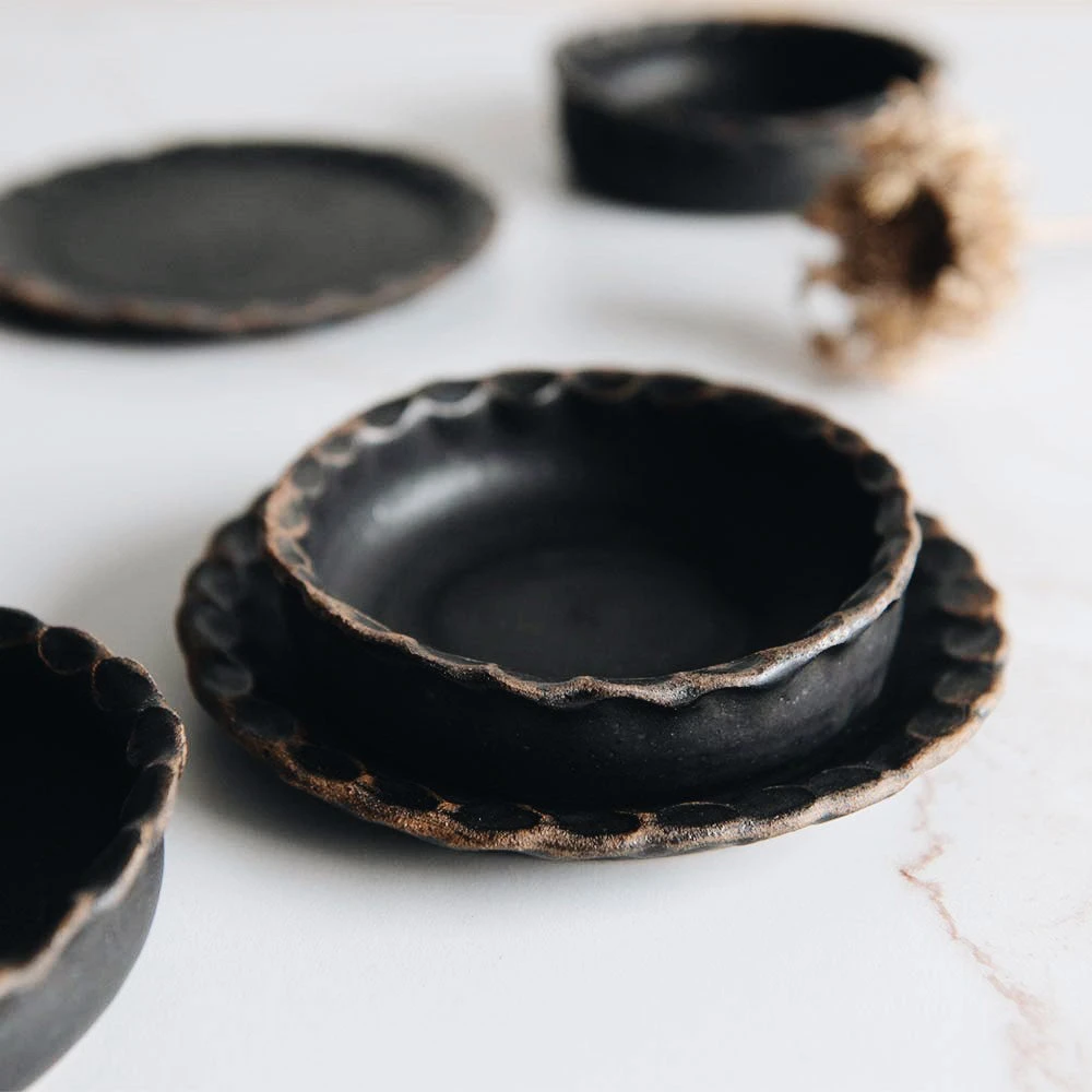 Hand-pinched, scalloped edge dishes are just as sweet as they can be! The little dishes are perfect for spices, ingredients, or sauces and dips. Use the plates for small bites and desserts. We also love both designs for your dish brush by the sink, candles, jewelry, or other bits and bobs around the home.