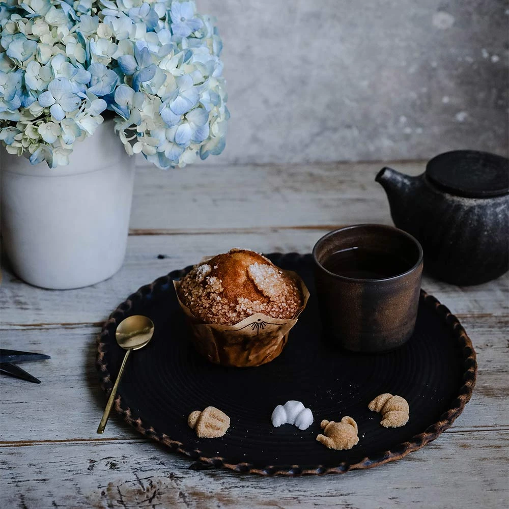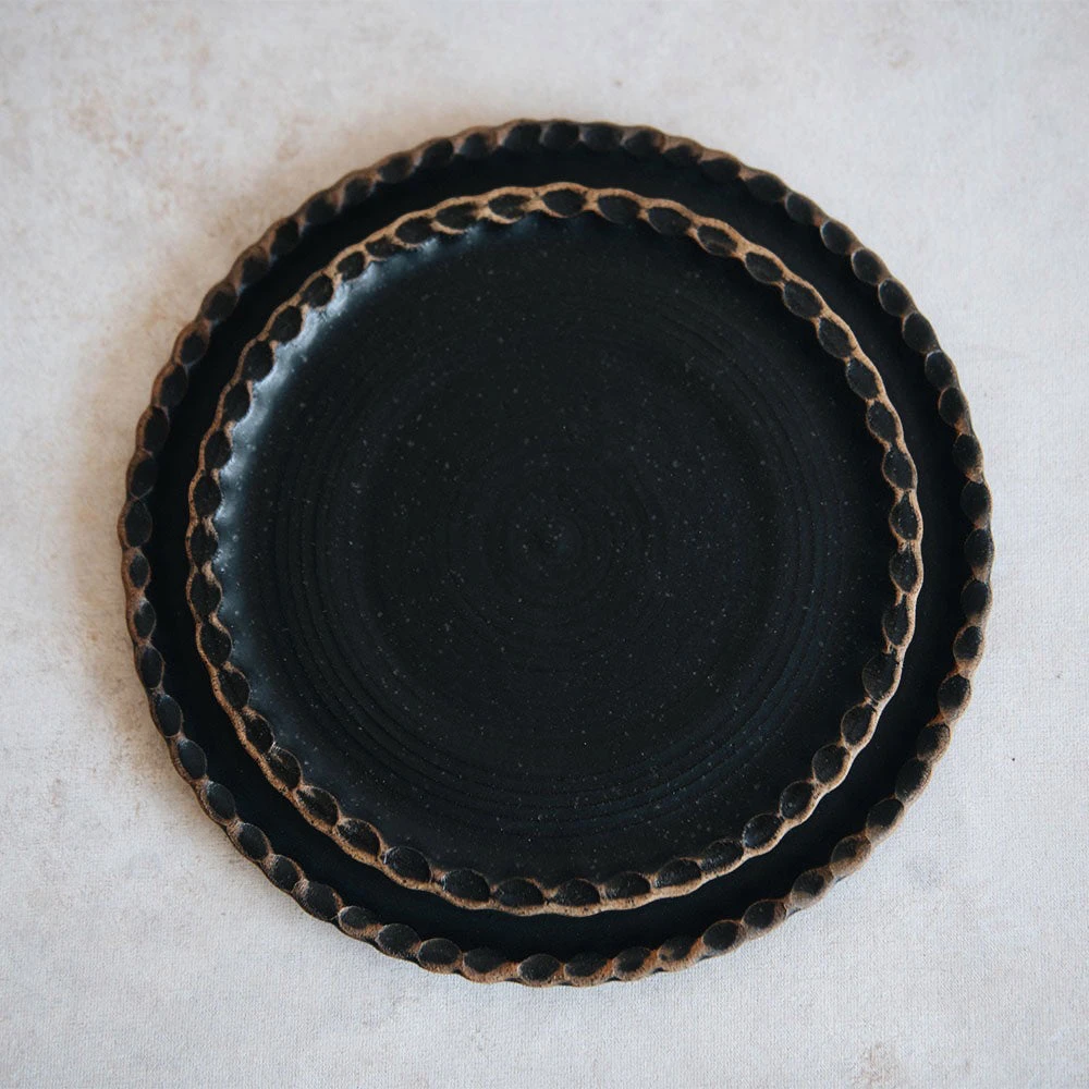 Hand-pinched, scalloped edge plates are just as sweet as they can be! With the hand-thrown rings and stripe, each plate will be one-of-a-kind.