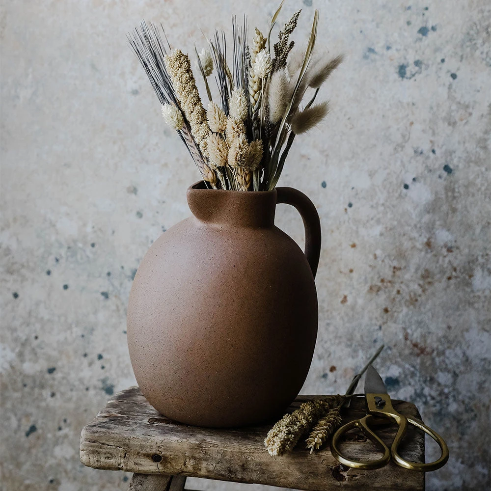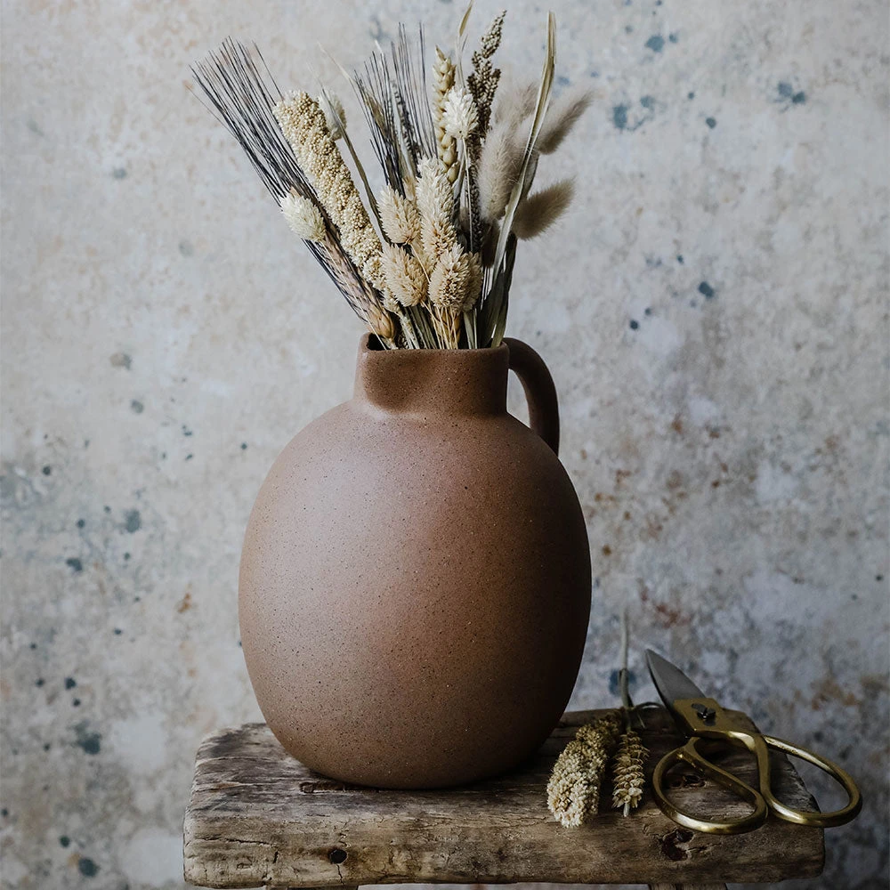 Stunning ceramic pitcher handcrafted in Mexico from local clay. Each of these gorgeous pieces is glazed only on the inside, the final earth tones and textures on the outside are the result of the different combinations of clays exposed to the heat of the kiln fire. Every pitcher will have its own unique design.
