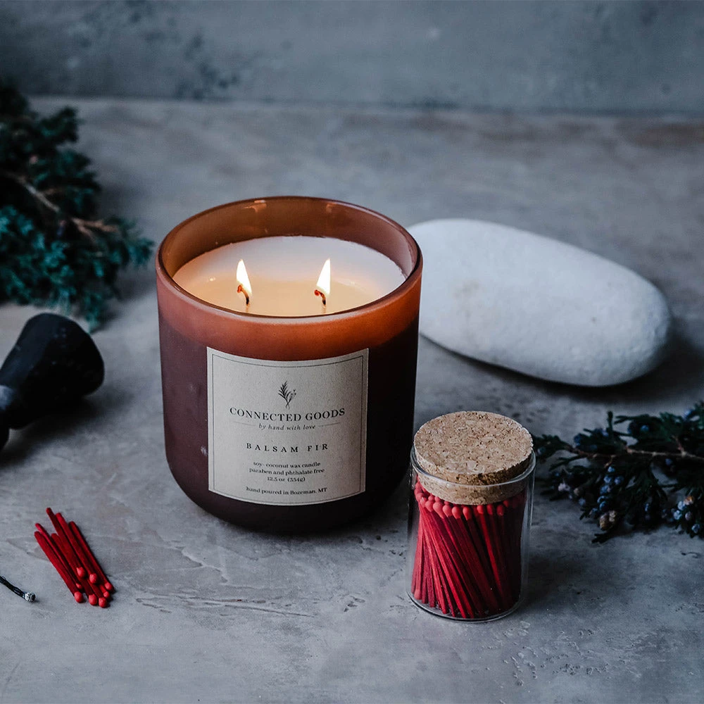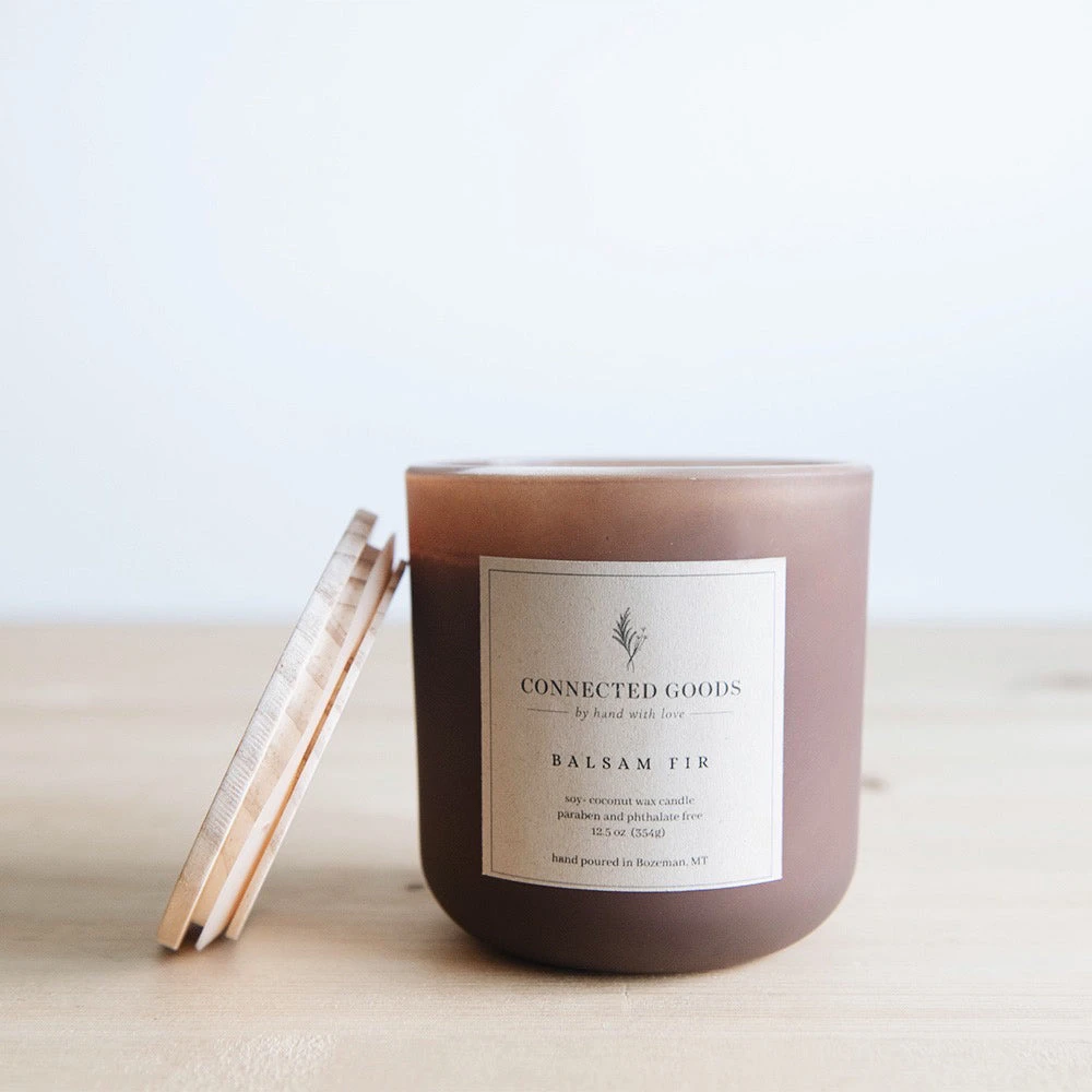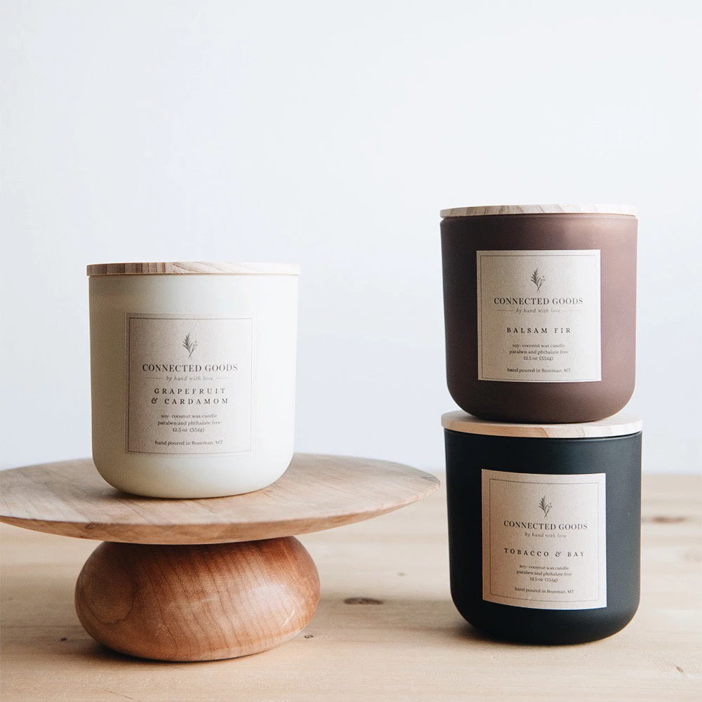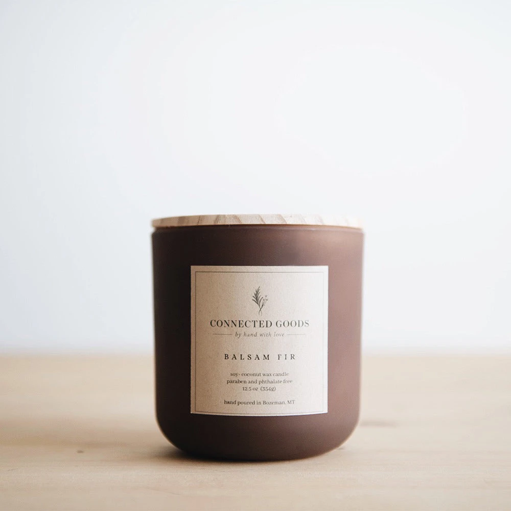 Our in-house signature candles are hand-poured in small batches right here in Bozeman, Montana. They are a big beautiful 12.5 oz size with a double wick. Crafted from a clean-burning soy/coconut wax blend.Â