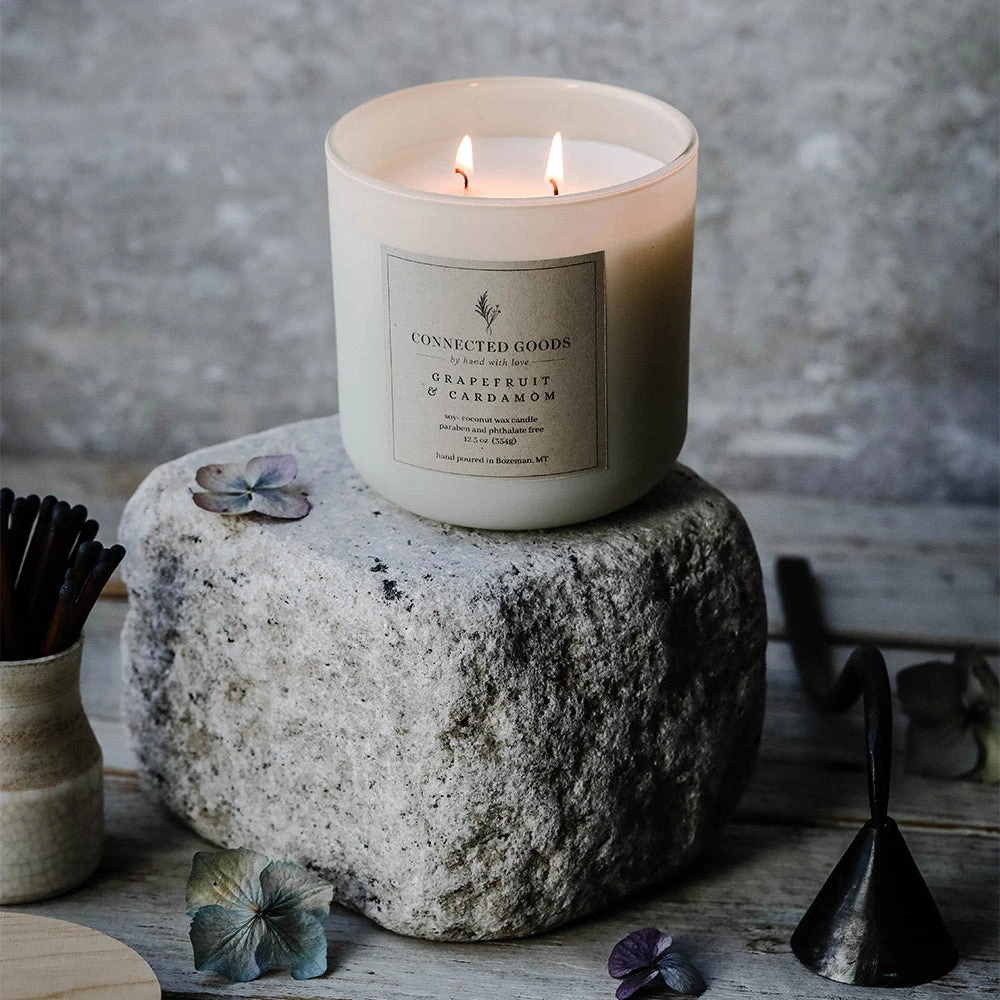 Our in-house signature candles are hand-poured in small batches right here in Bozeman, Montana. They are a big beautiful 12.5 oz size with a double wick. Crafted from a clean-burning soy/coconut wax blend.Â