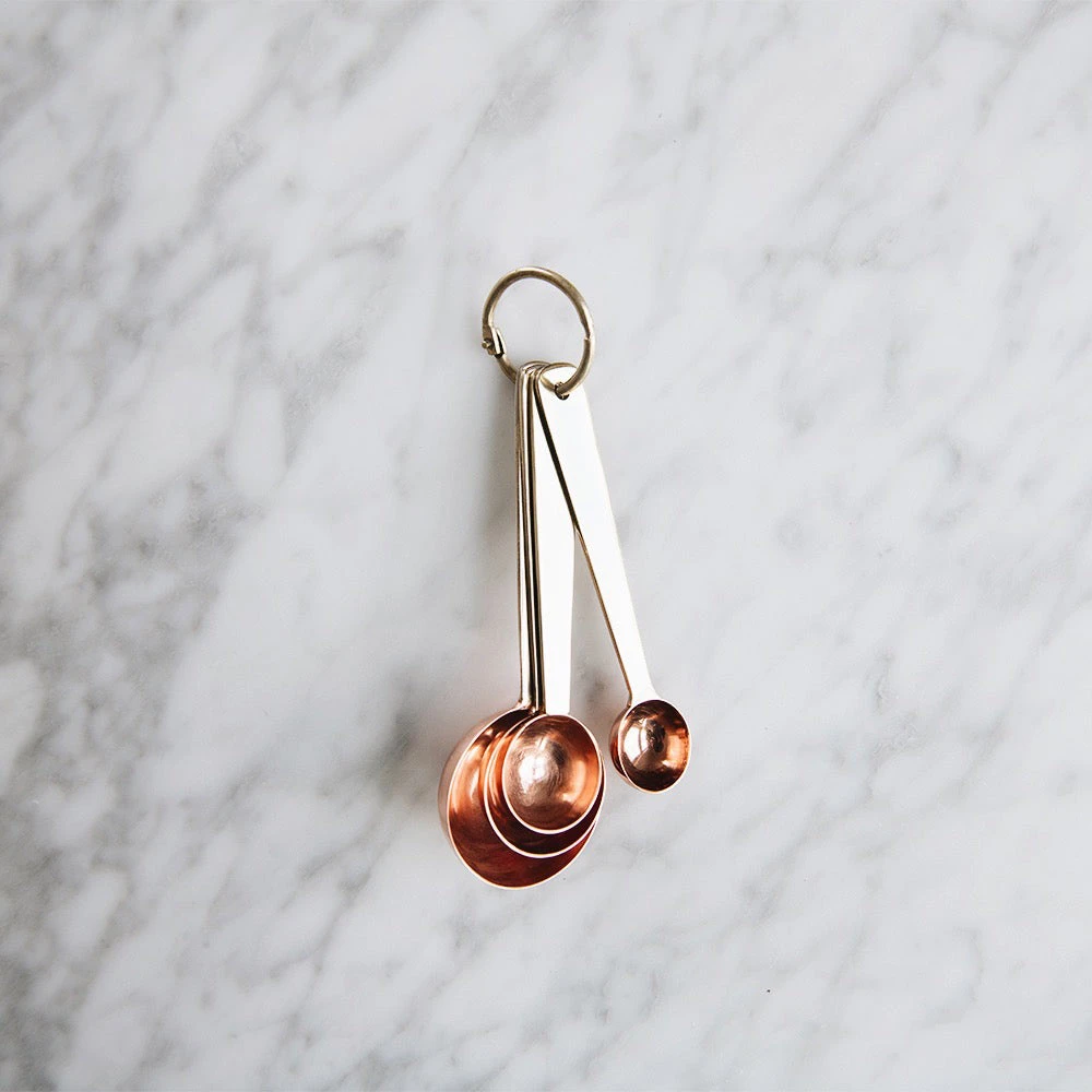 Copper and brass measuring spoons for the kitchen.