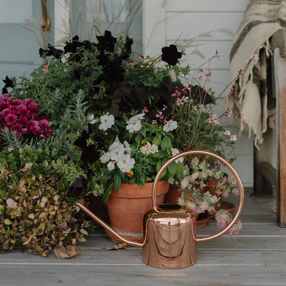 This durable, copper watering can is an essential tool for all indoor and outdoor gardening tasks. Made of copper-plated stainless steel. Copper may darken over time as a natural patina develops. Oxidation will occur more quickly if used and stored outdoors.