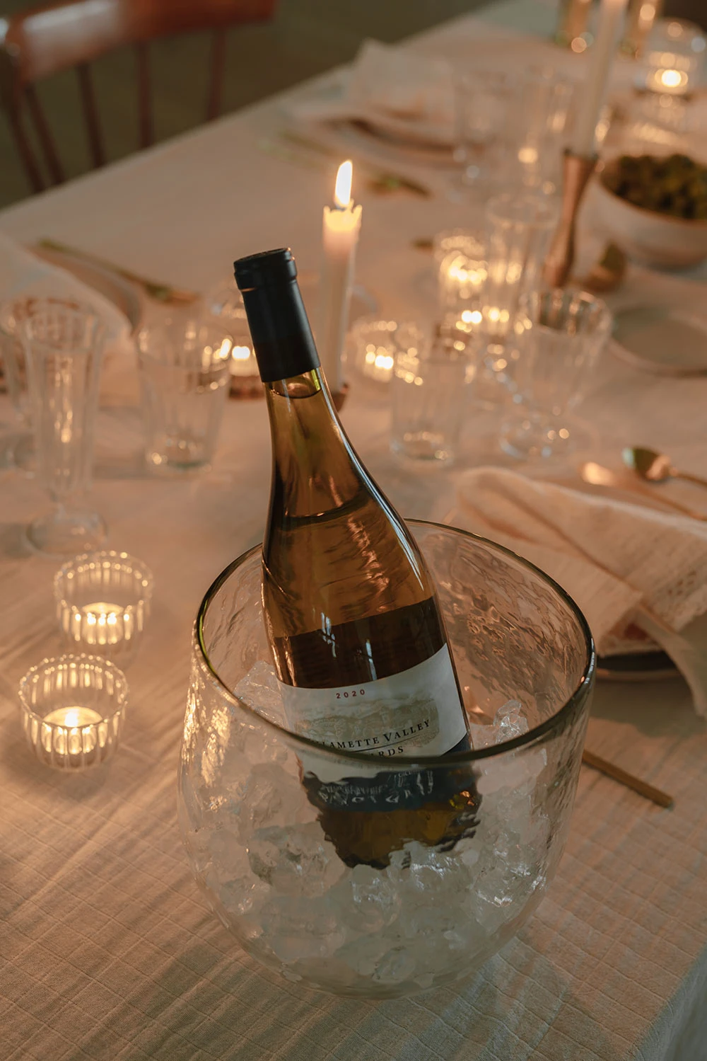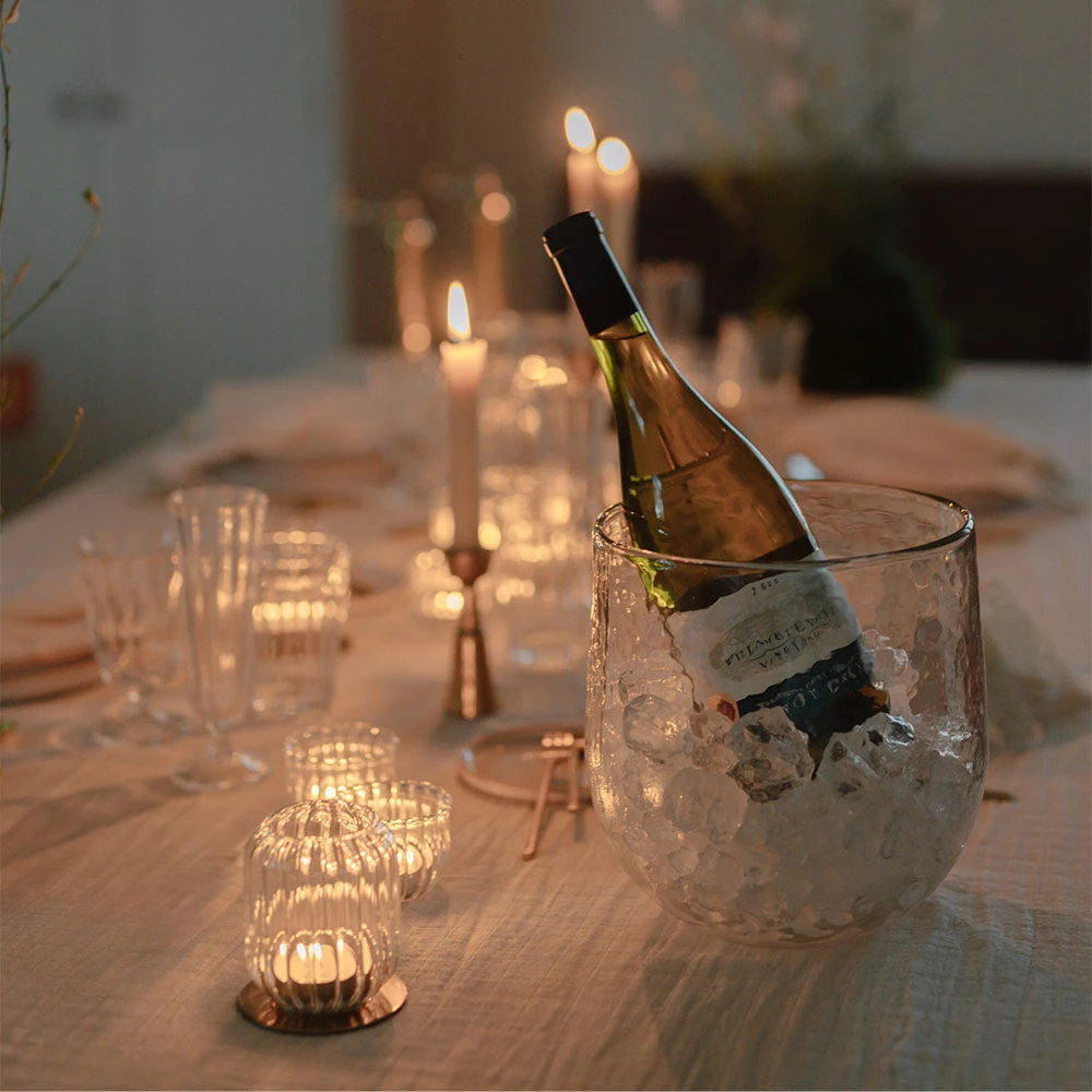 With its thick walls, this piece retains the cold of ice for extended periods, while its subtly hammered texture adds a captivating visual element to any celebration. It also serves as a robust vase or an elegant hurricane, demonstrating versatile utility.