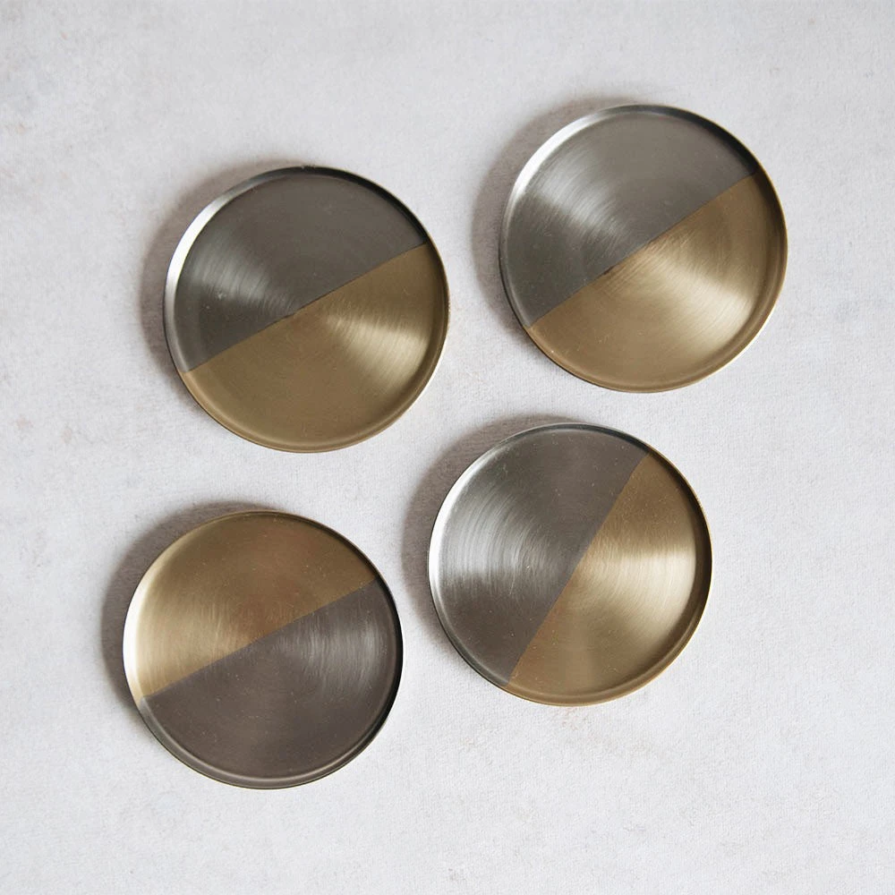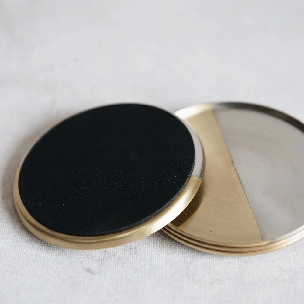 These perfectly simple and beautiful coasters are handmade by skilled artisans in India. Crafted from a single sheet of brass using pure metals and alloys that develop a unique patina over time, each one is backed with a protective bottom to safeguard your delicate surfaces.