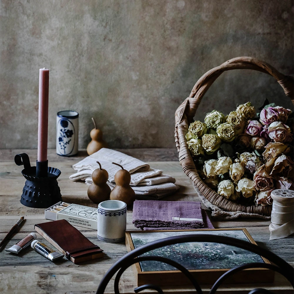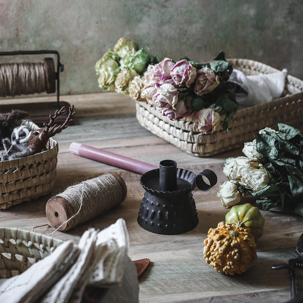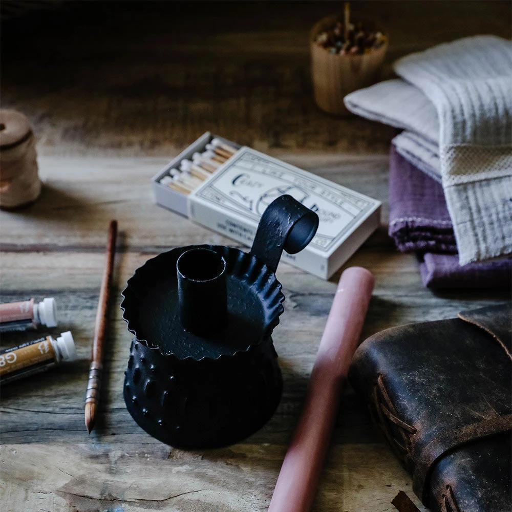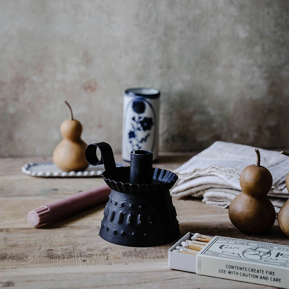 Designed to accommodate a standard taper candle, this candlestick holder features a textured black finish, punched design, and a fluted edge.