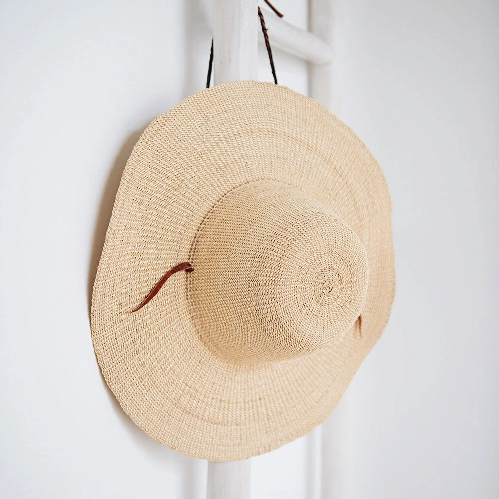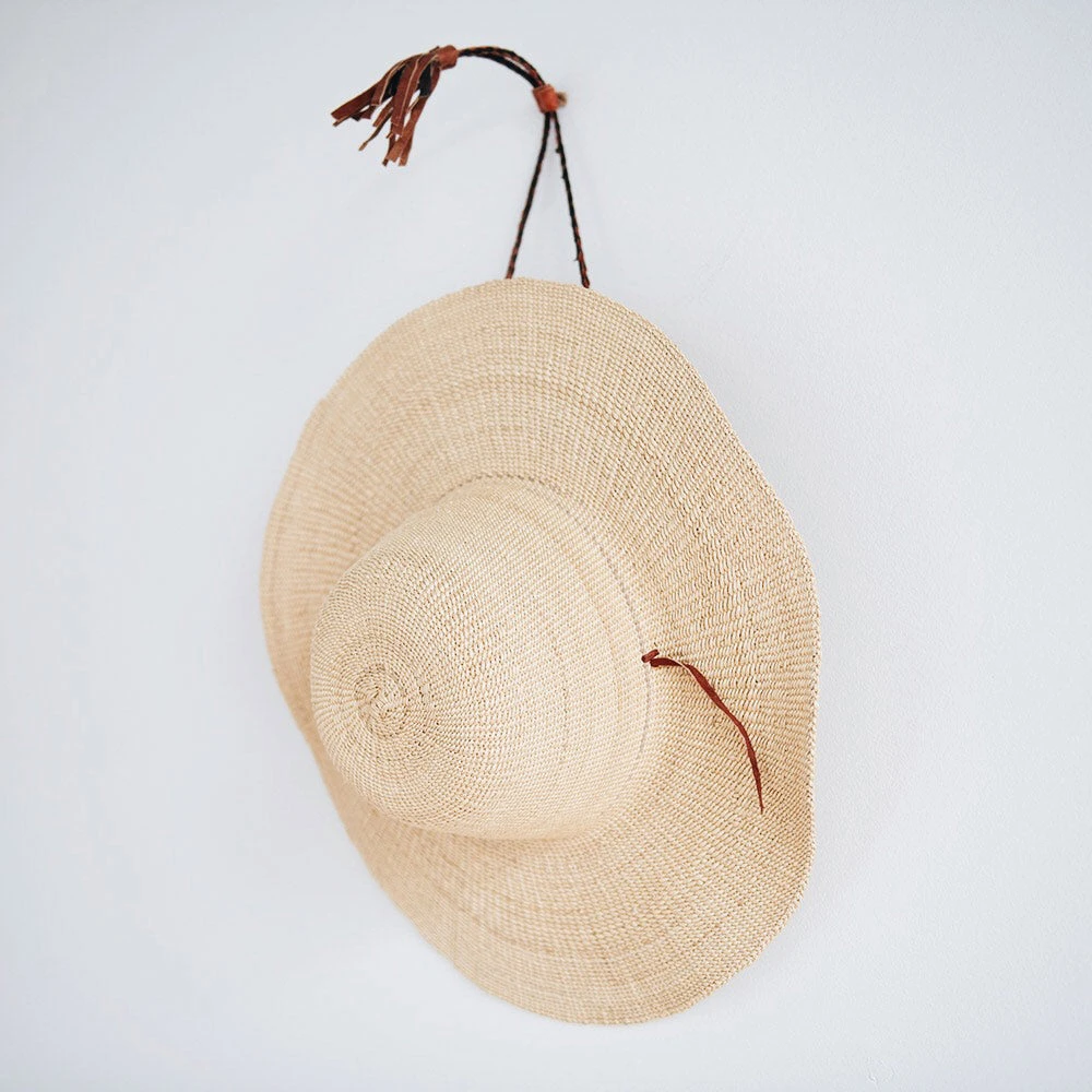 Ghanaian artisans weave stiff elephant grass into this fun sun hat with a classic shape and braided leather string.Â