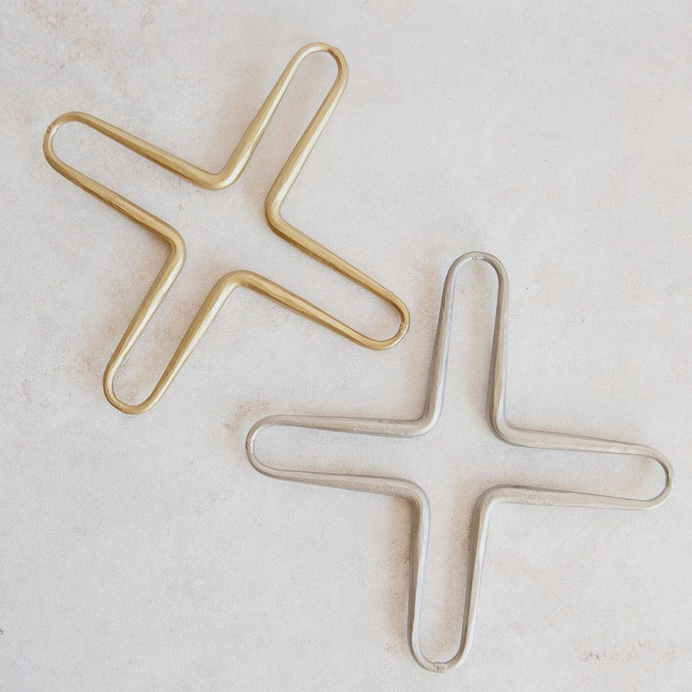 Steel trivets, available in two distinct finishes, serve as both playful and practical landing spots for hot plates and pots. Meticulously crafted from steel, these trivets offer decorative versatility with their hammered brass and pewter finishes.