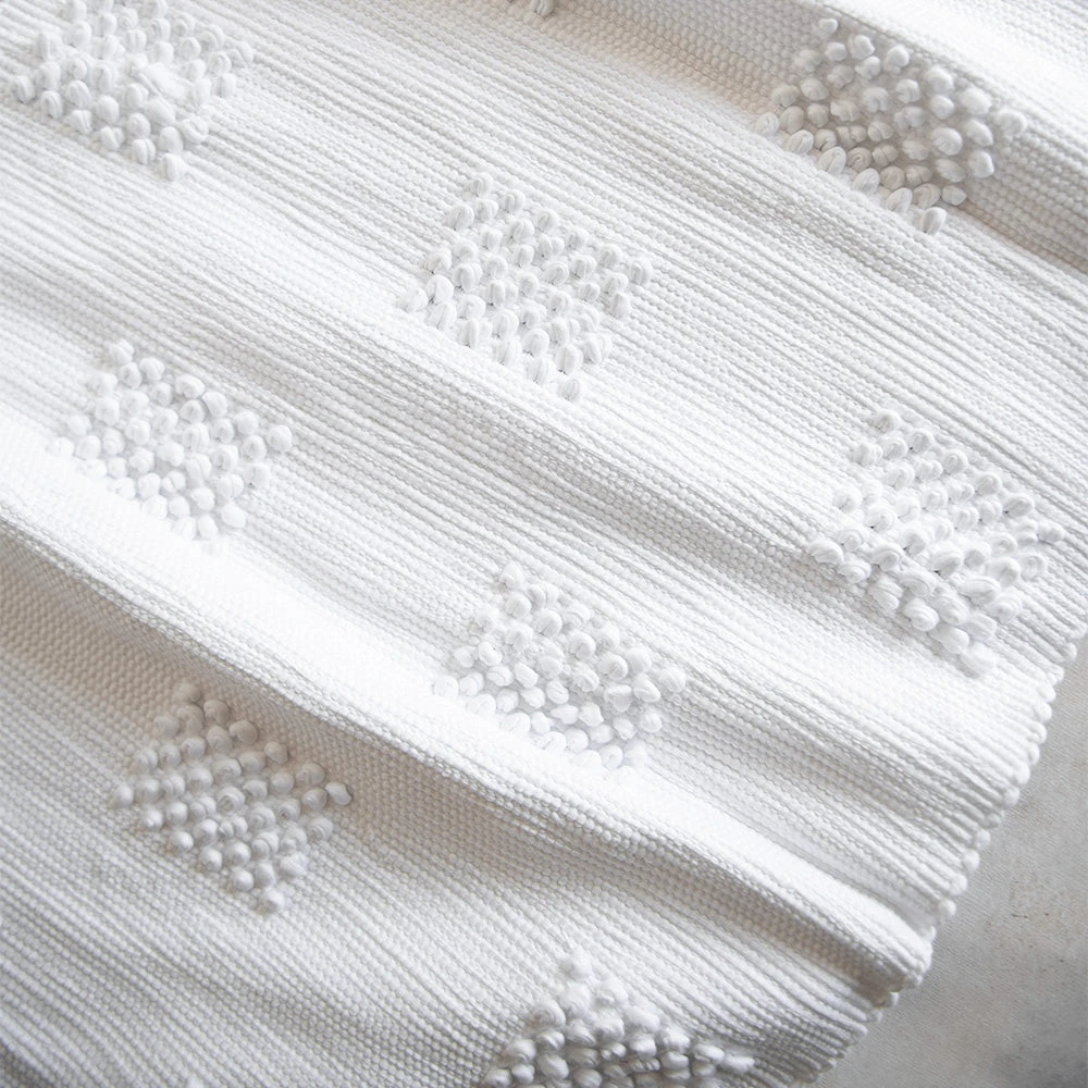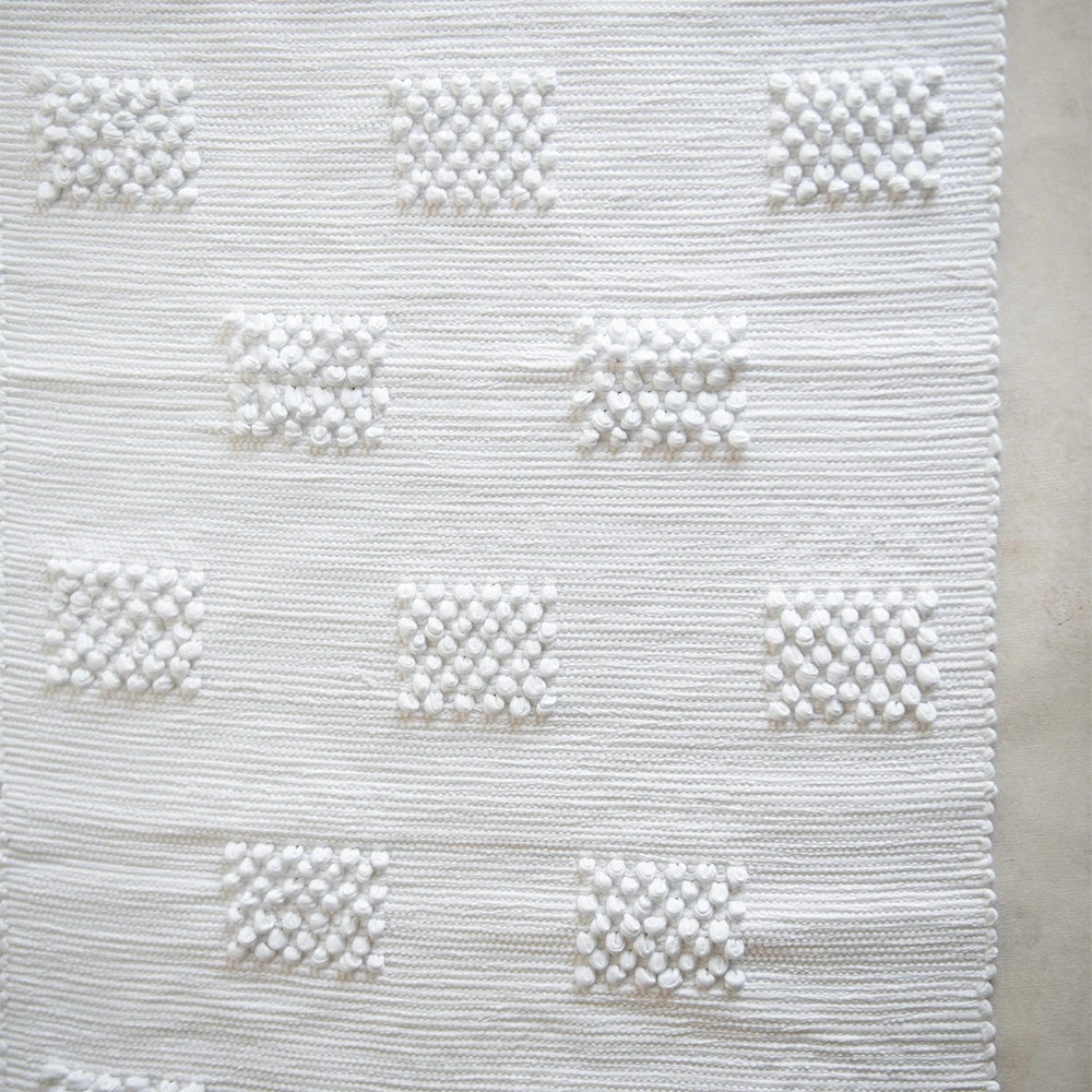 Crisp, clean bath mats with a beautiful, simple design that also pays very close attention to special details. These white cotton bath mats are repurposed from selvaged ends of jersey from tee shirt factories. Each one is lovingly handwoven and knotted by artisans in Portugal.Â