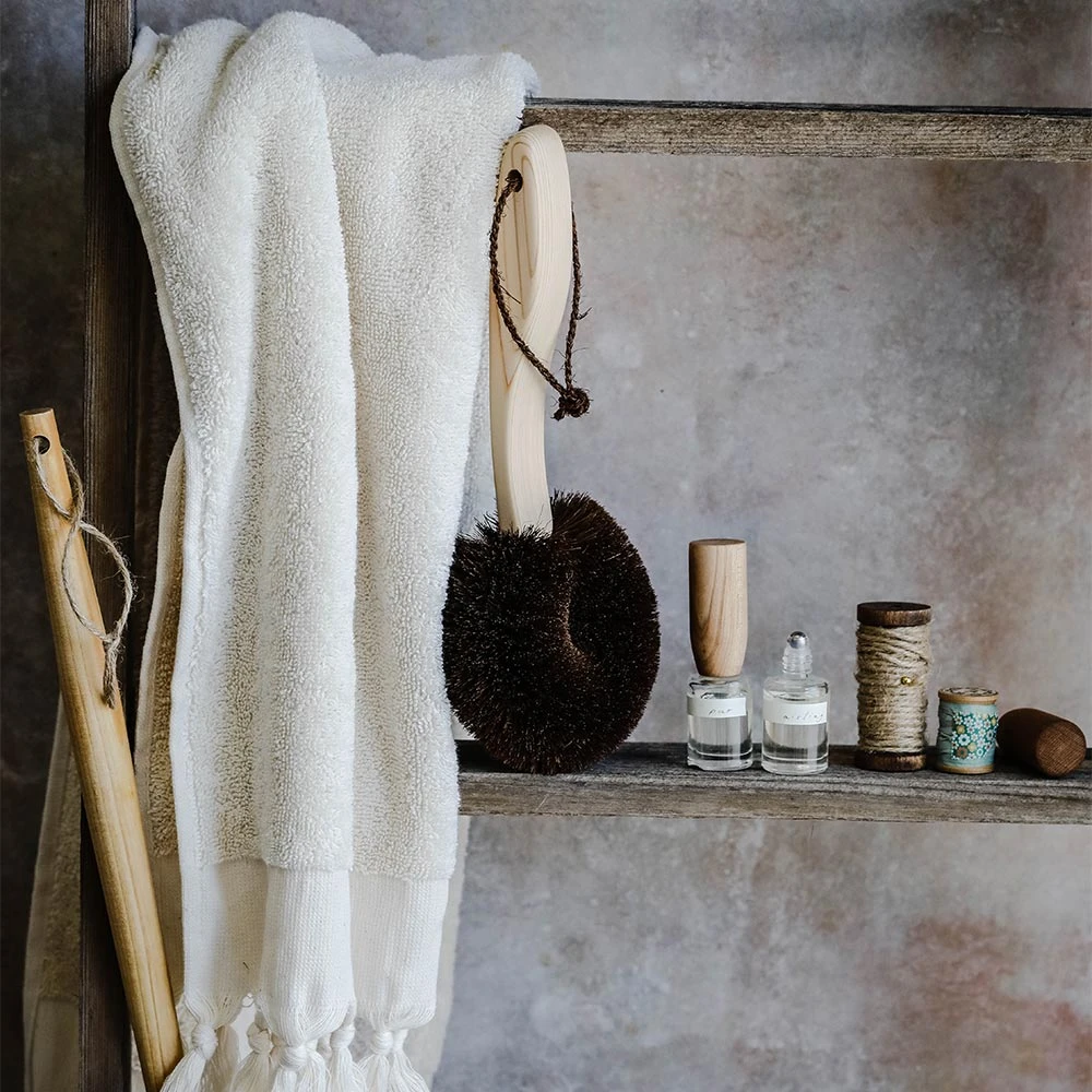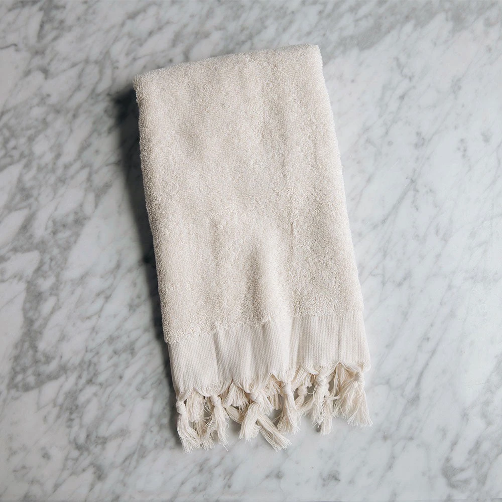 100% Turkish cotton, hand-loomed, edged with handmade fringe, the towel is OEKO-TEX® certified and free from harmful chemicals.