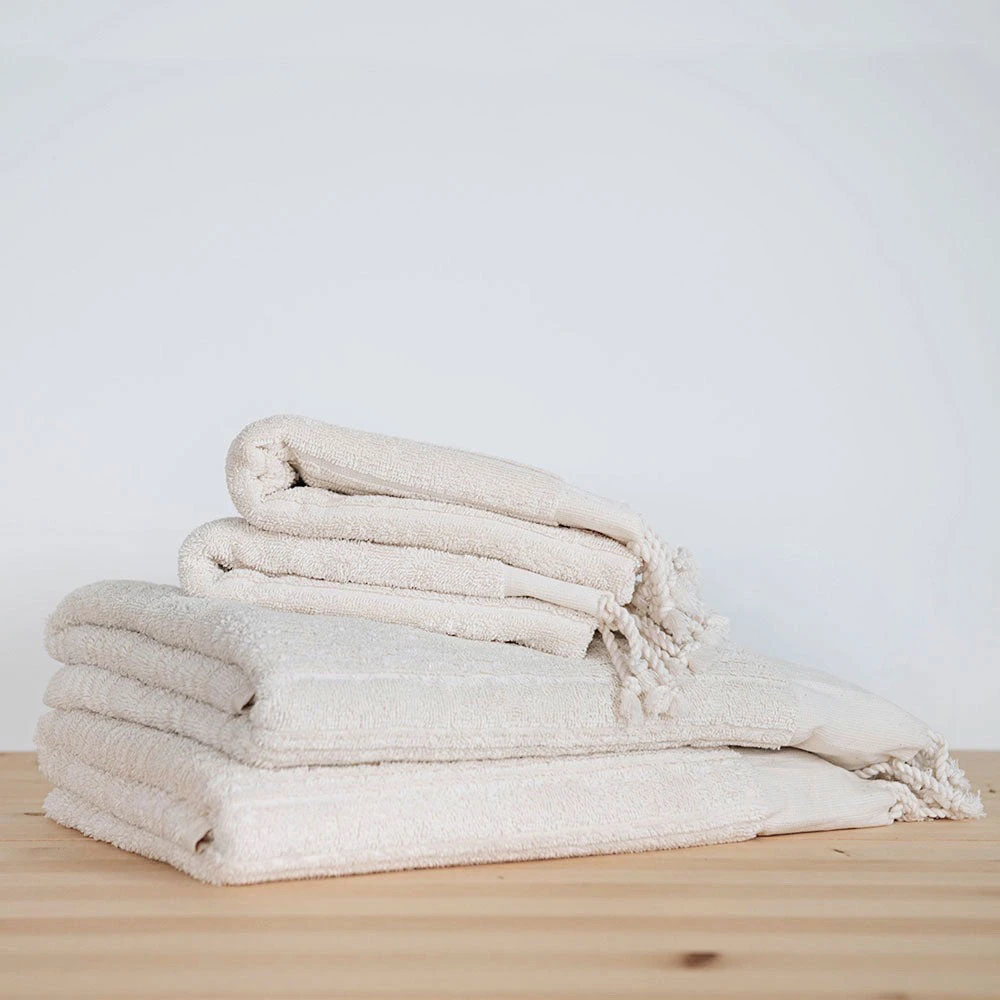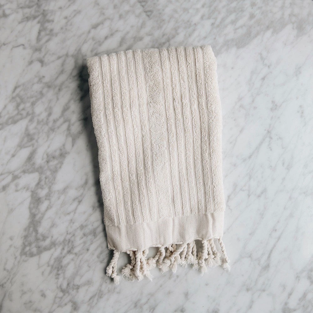100% Turkish cotton, hand-loomed, edged with handmade fringe, the towel is OEKO-TEX® certified and free from harmful chemicals.
