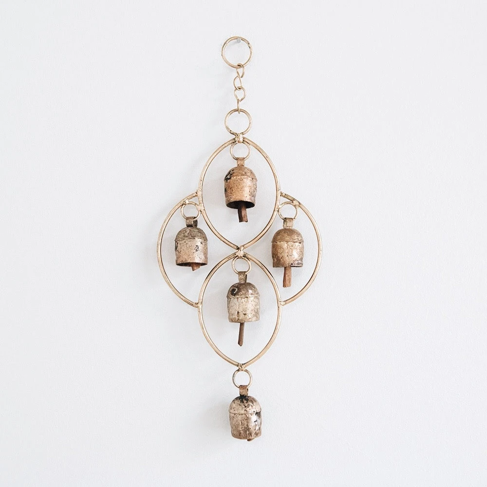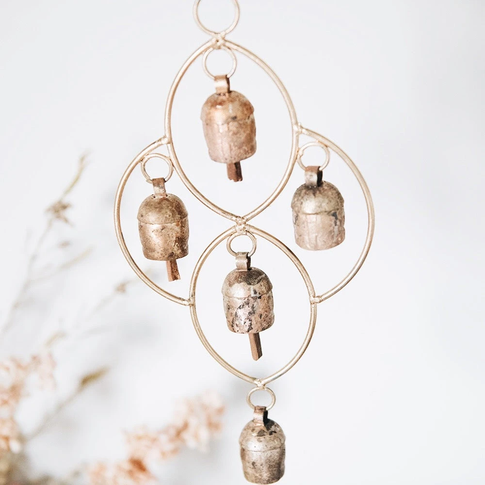 Upcycled metal hanging bell chime displays five handcrafted copper bells in a quatrefoil design with sturdy hanging loop. The bells are crafted from recycled iron sheets, which are covered in copper alloys. No rivets or nails are used for fixing the various components together. Its raw, rustic texture adds to the appeal.Â