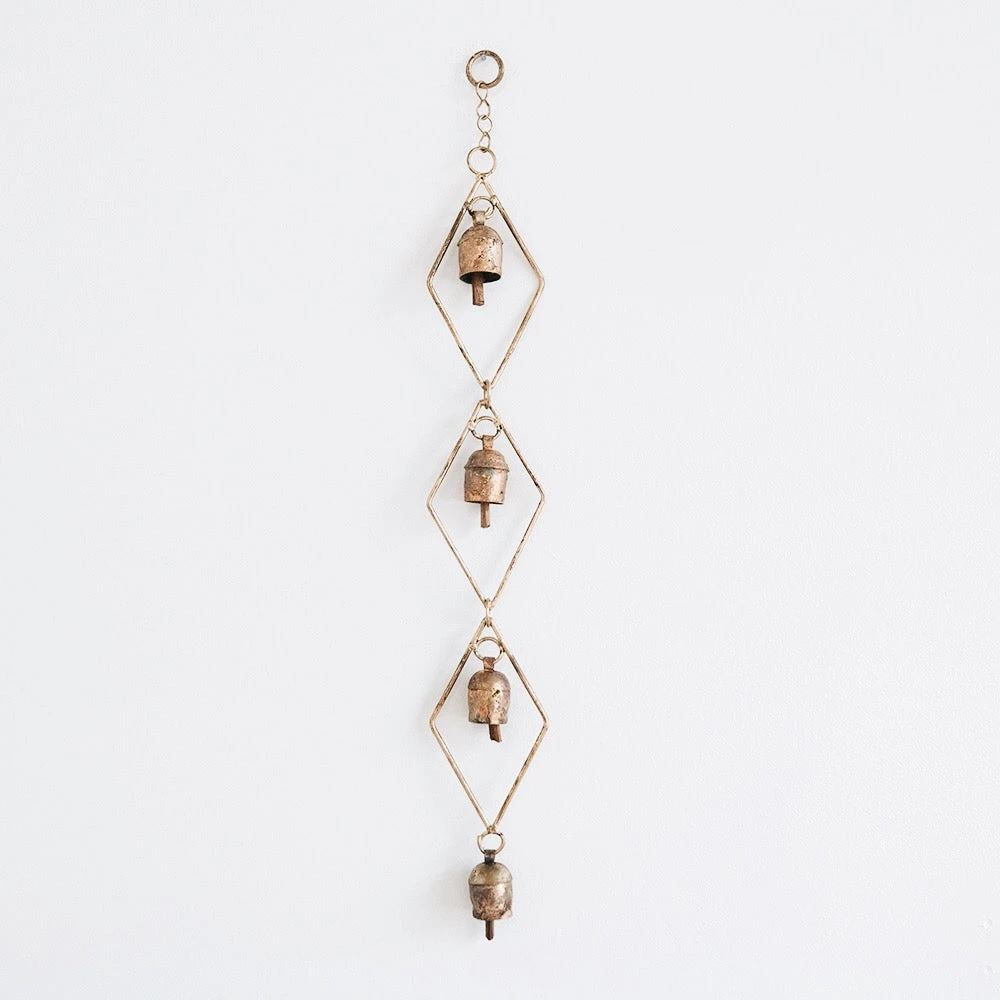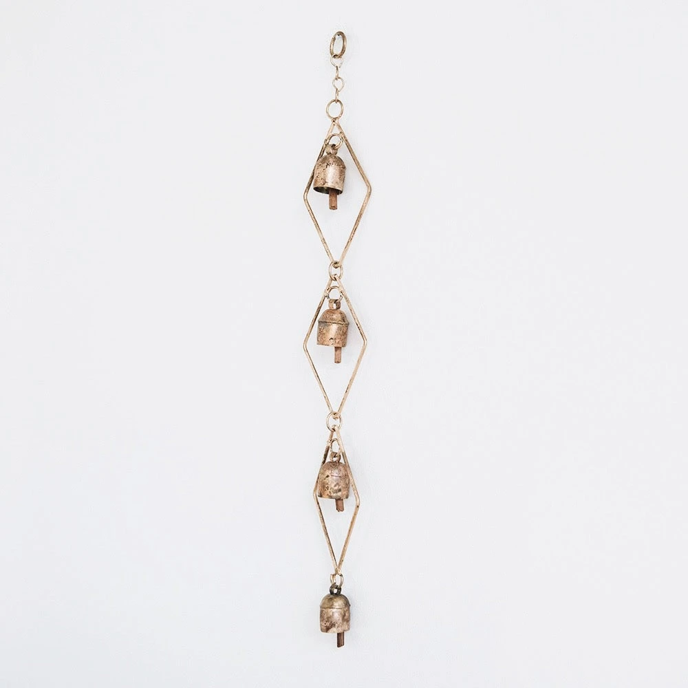 Upcycled metal hanging bell chime displays four handcrafted copper bells in a cascading loop setting with sturdy hanging loop. The bells are crafted from recycled iron sheets, which are covered in copper alloys. No rivets or nails are used for fixing the various components together. Its raw, rustic texture adds to the appeal.Â