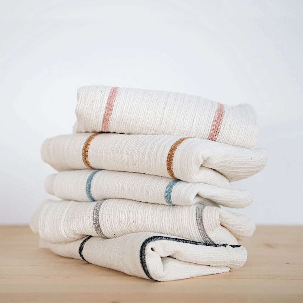 This collection is completely handmade of hand-spun and hand-dyed cotton. The Ethiopian cotton adds a uniquely rich texture that will continue to soften and become more absorbent with each wash/dry.
