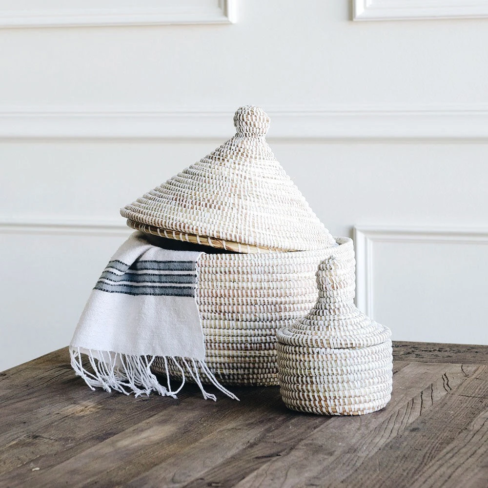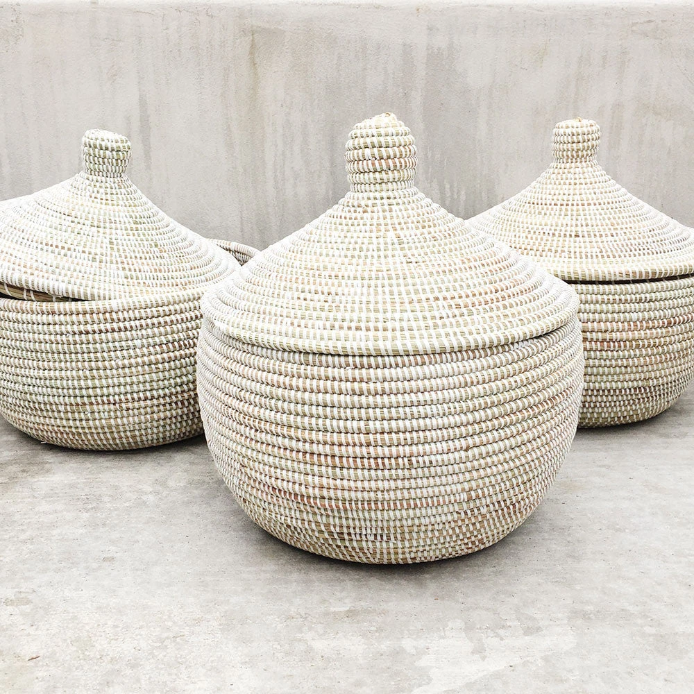Handmade by women in West Africa, this beautiful lidded basket is from a local grass called njodax and plastic strips used in the production of bazin mats, which resemble prayer mats. Great gift item, or a thoughtful way to gift homemade cookies.