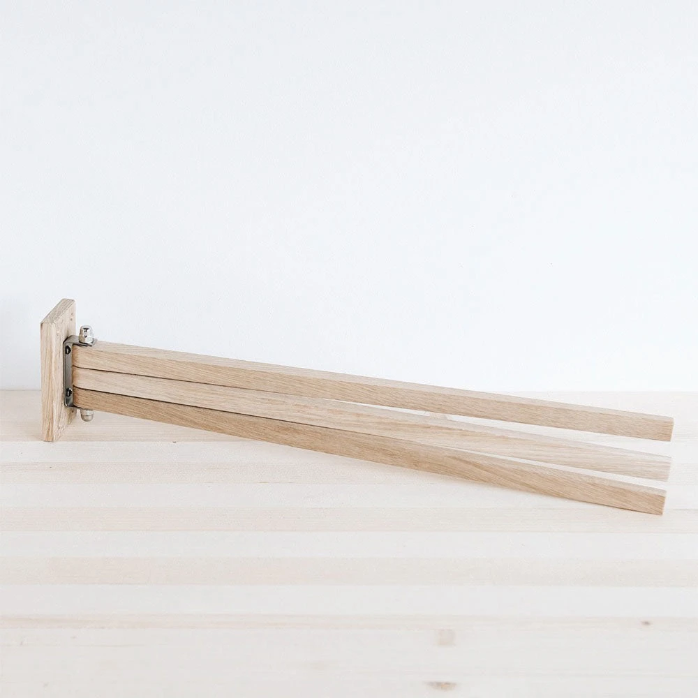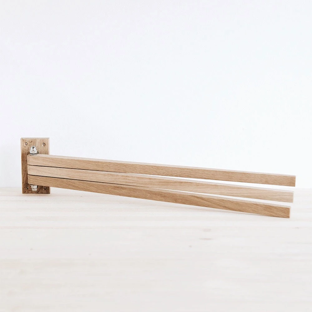 Solid oak towel rack with three arms. Perfect for the kitchen, bath, laundry room or even the mudroom!