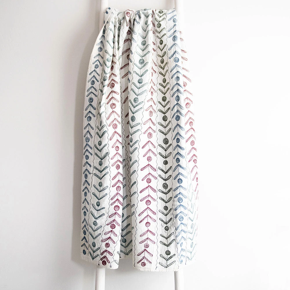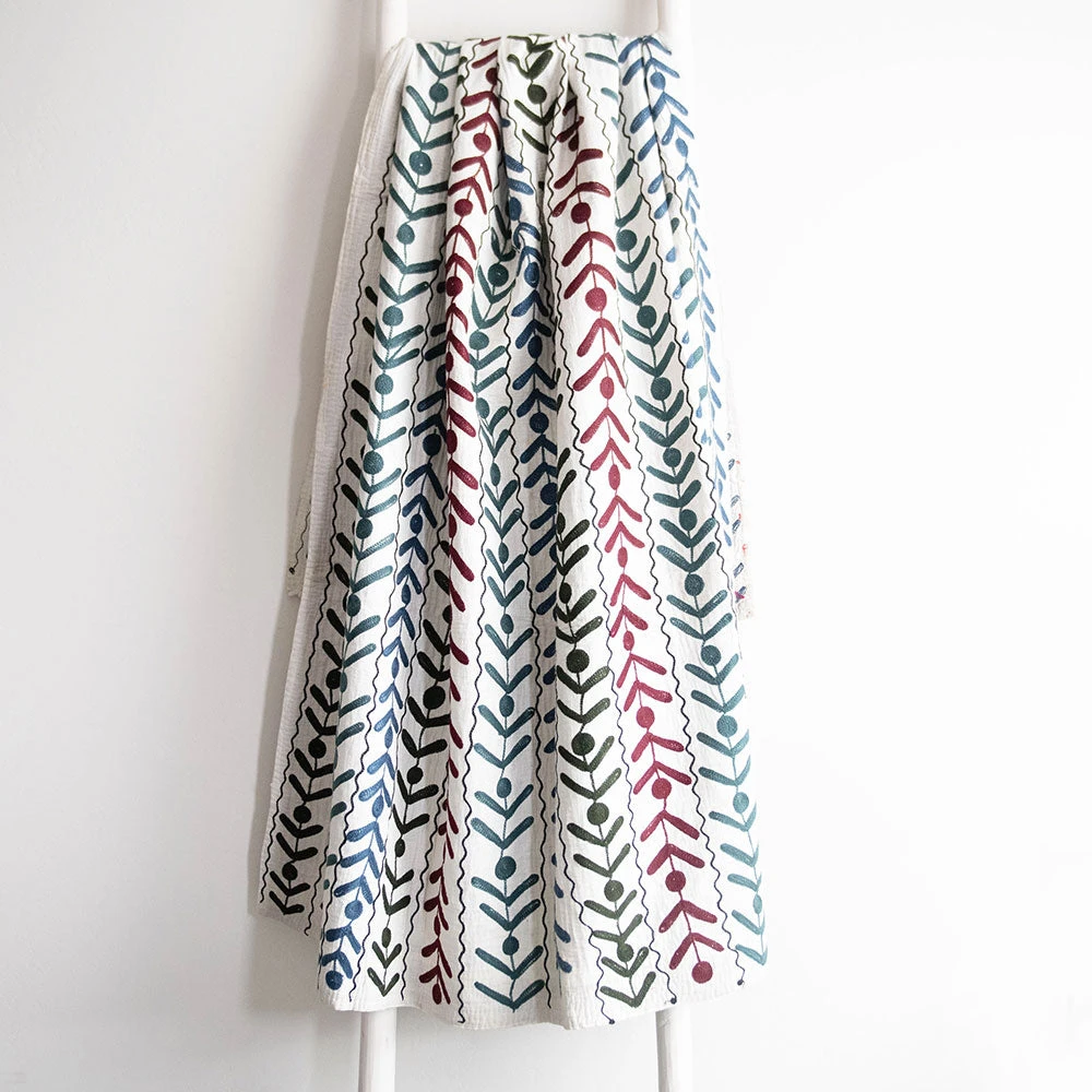 PLEASE NOTE: Like any hand-stitched embroidery work, the back side of these textiles will show loose threads. You can expect the textile to need some trimming if you like a clean look. We recommend trimming loose threads short with scissors as needed.