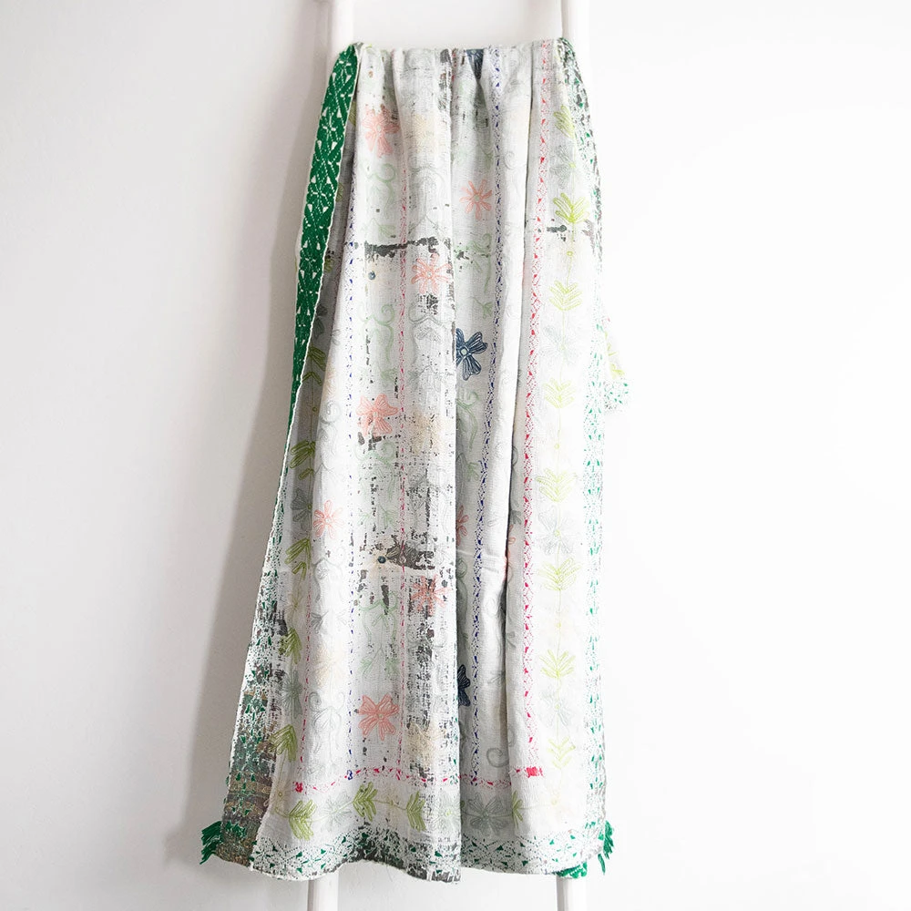 This quilt is approximately 40-50 years old. Kantha quilts consist of several layers of recycled cotton or saris. The vintage sari material is then stitched together with colorful thread to create these beautiful, softly layered cotton throws. The “kantha” stitch is applied row after row and gives the fabric its unique wrinkled effect. This kind of embroidery is most popular with rural women of India who spend hour upon hour creating these wonderful, one-of-a-kind pieces. The top layer of the quilt may start peeling off (due to wear), letting the layer below shine through.