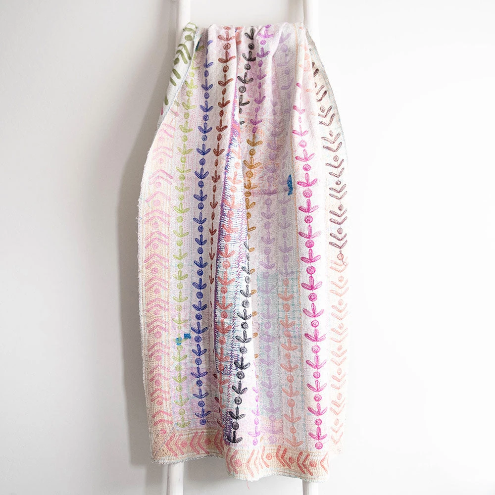 This quilt is approximately 40-50 years old. Kantha quilts consist of several layers of recycled cotton or saris. The vintage sari material is then stitched together with colorful thread to create these beautiful, softly layered cotton throws. The “kantha” stitch is applied row after row and gives the fabric its unique wrinkled effect. This kind of embroidery is most popular with rural women of India who spend hour upon hour creating these wonderful, one-of-a-kind pieces. The top layer of the quilt may start peeling off (due to wear), letting the layer below shine through.
