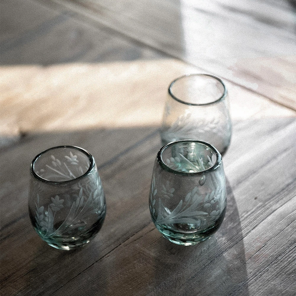 Beautifully shaped and sustainable, these petite tumblers are handblown from recycled glass and have a floral design hand etched into the glass.