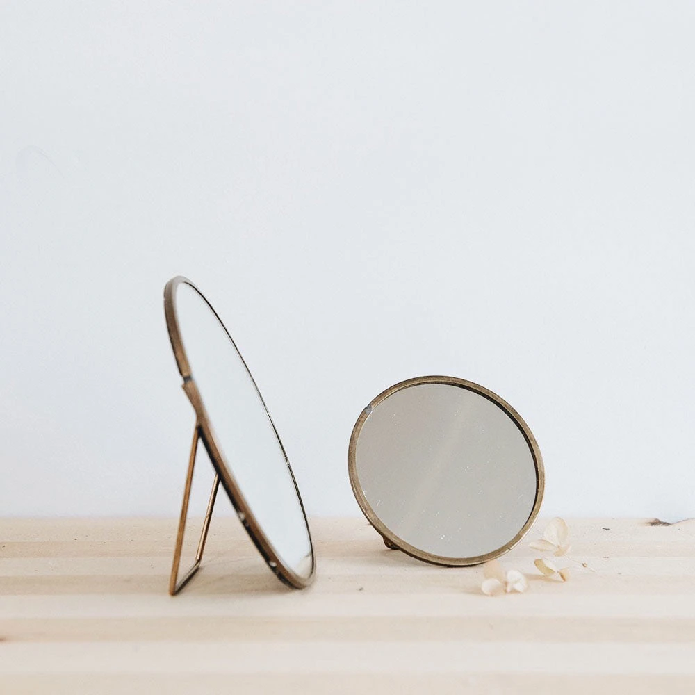 Simple and elegant, these charming standing mirrors are perfect for a dressing table or sideboard decoration. The circular brass frame has been handcrafted around the mirrored glass in this timeless design. The metal is skillfully soldered around the glass with traditional tools; this handmade process means that there are weld marks on the joins of each piece, a feature that we love as it tells the story of how the product is made.