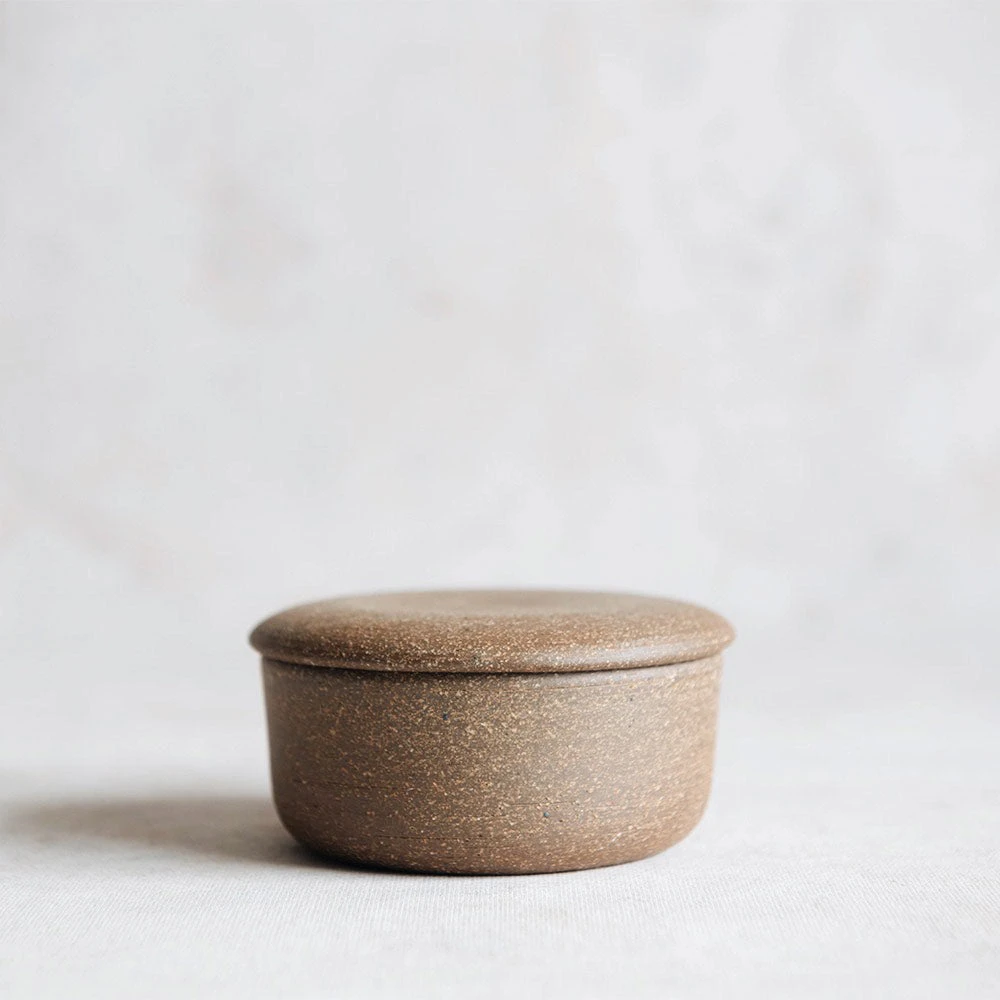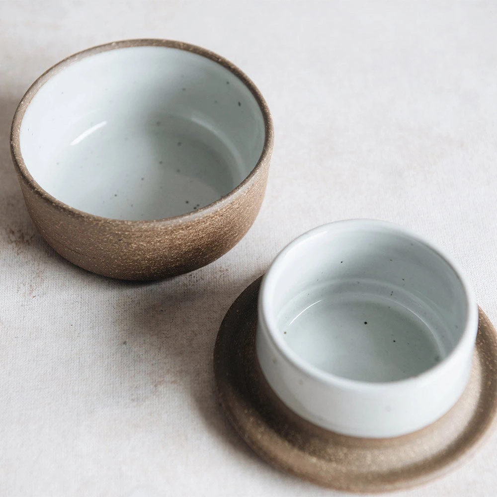 This gorgeous hand-thrown butter keeper keeps butter fresh with a unique trick that uses water to create a barrier between the butter and outside air. The base of the dish is filled with about a quarter inch of water and the lid of the dish is packed with soft butter. The dish is stored at room temperature with the lid inverted. The butter hangs upside down allowing the rim to touch the surface of the water(creating the seal). Not only does this store your butter in style but more importantly it stores your butter at room temperature so it is soft and spreadable. The inside is finished with a speckled white glaze which provides an easy-to-clean surface and a nice contrast to the rustic exterior.Â