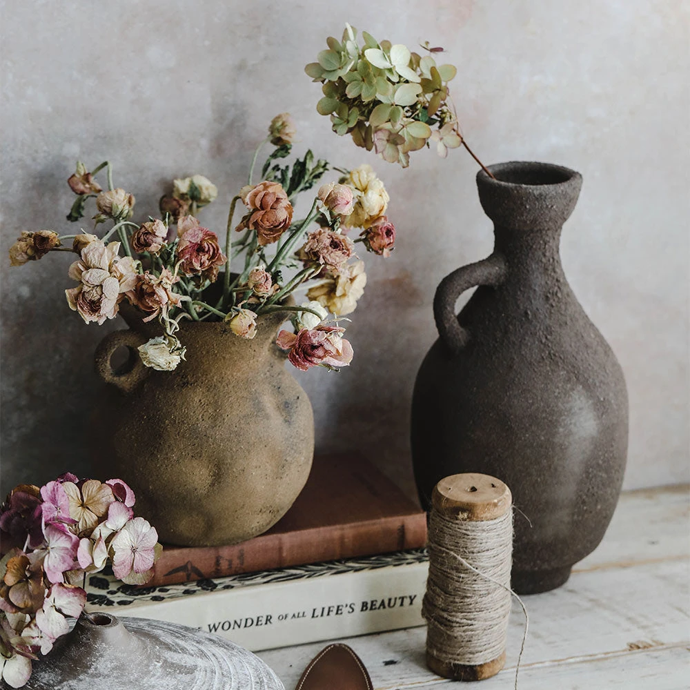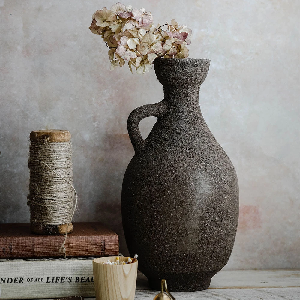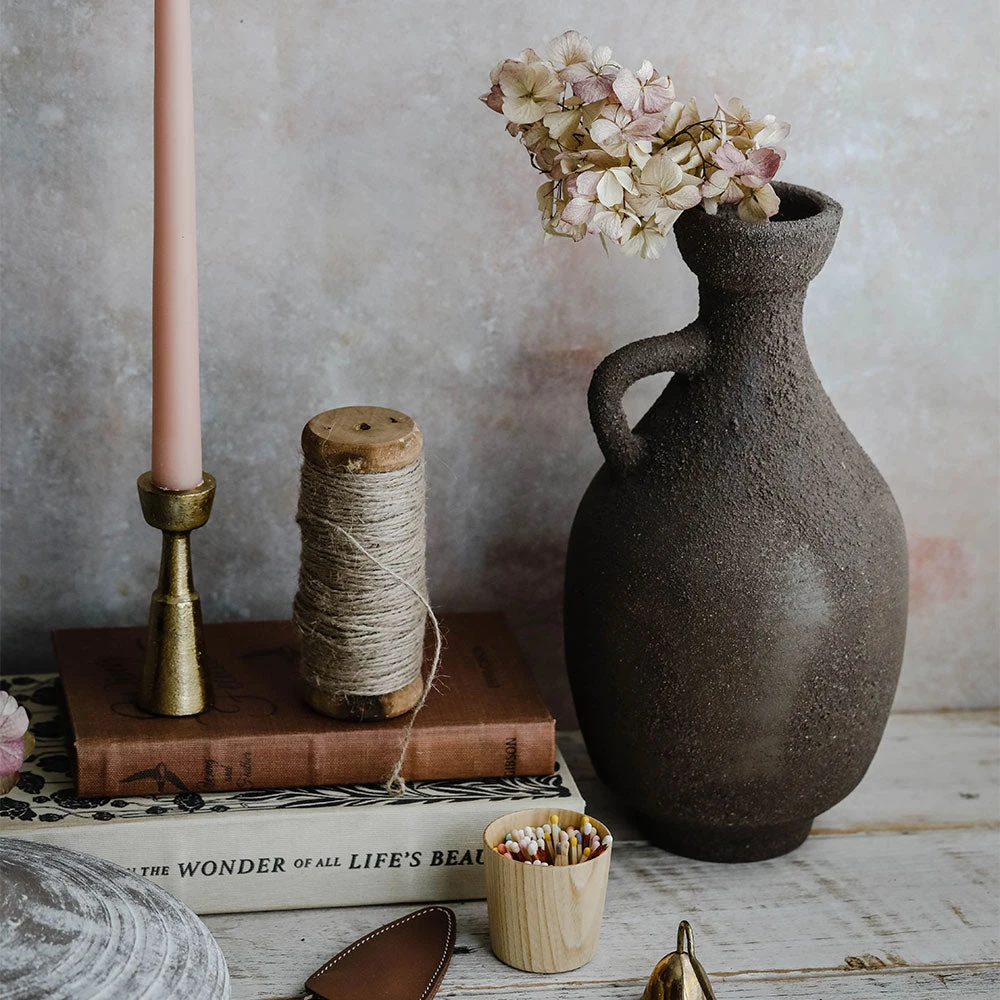 A textured surface and stunning brownstone-colored clay vessel handmade in Mexico. These clay vases are designed to be styled as decorative pieces or with dried florals.