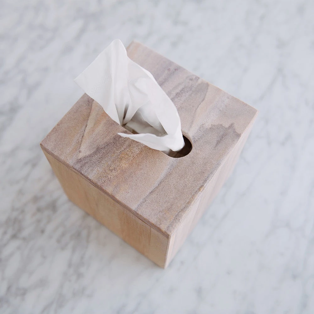 This stunning sandstone tissue cover has various warm tones layered throughout. The gorgeous natural material comes from the mountains of India.Â