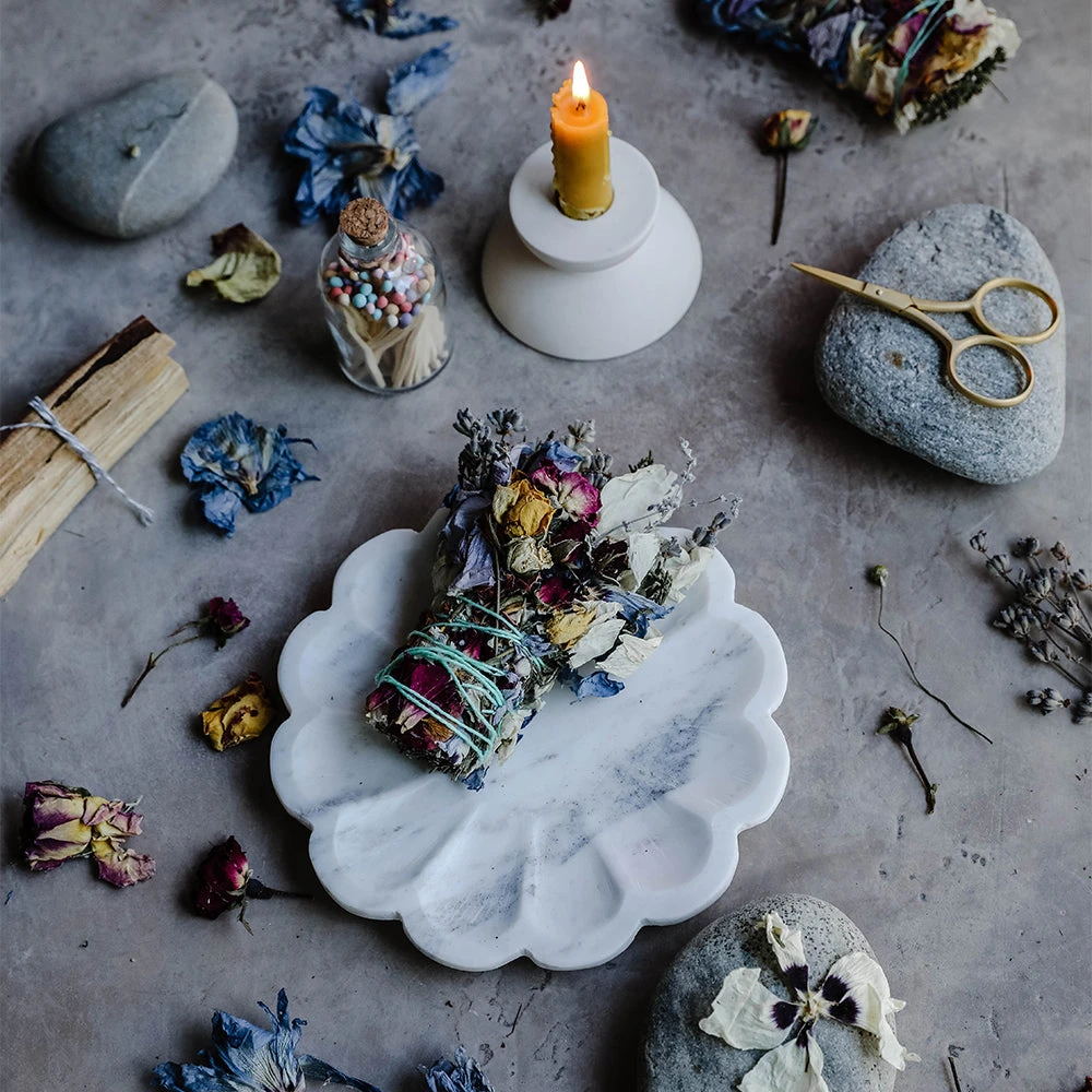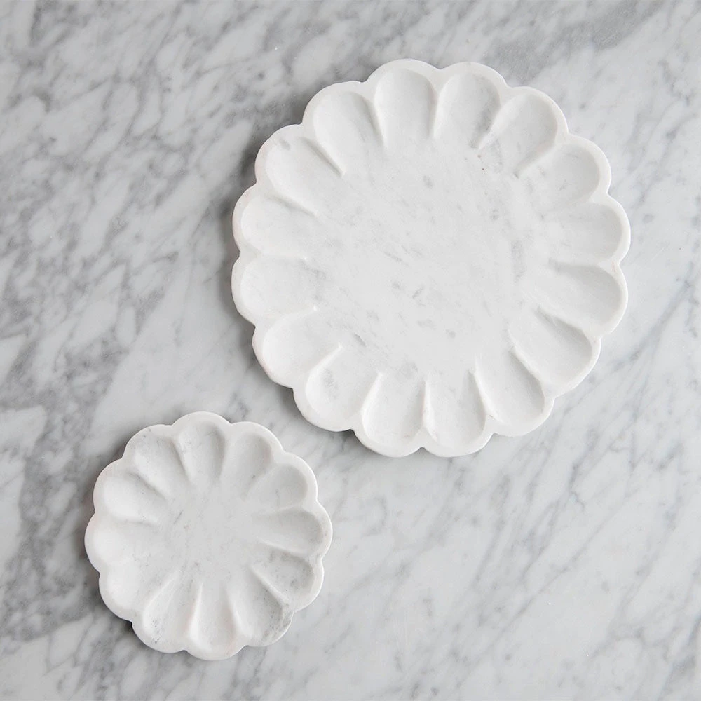 These artfully sculpted marble trays are entirely handcrafted by skilled artisans in India. Reminiscent of flowers in bloom, these marble petal trays feature an intricate scalloped edge.