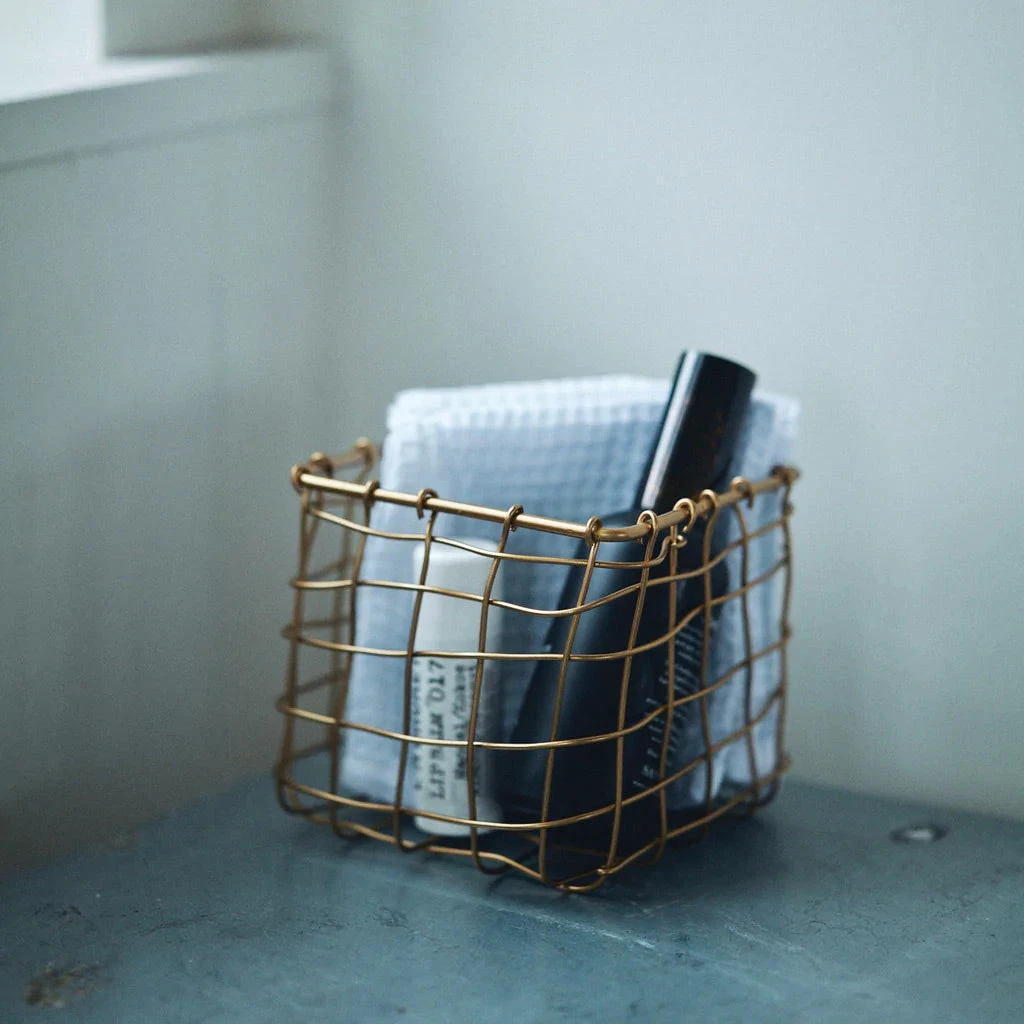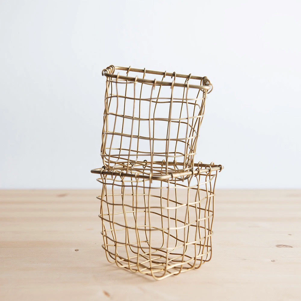 Brass wire baskets are the perfect solution for organizing small spaces. Hand-woven in a malleable brass wire. This item is hand-made and each basket will exhibit its own character. Variations will occur in the texture of this hand-made item.