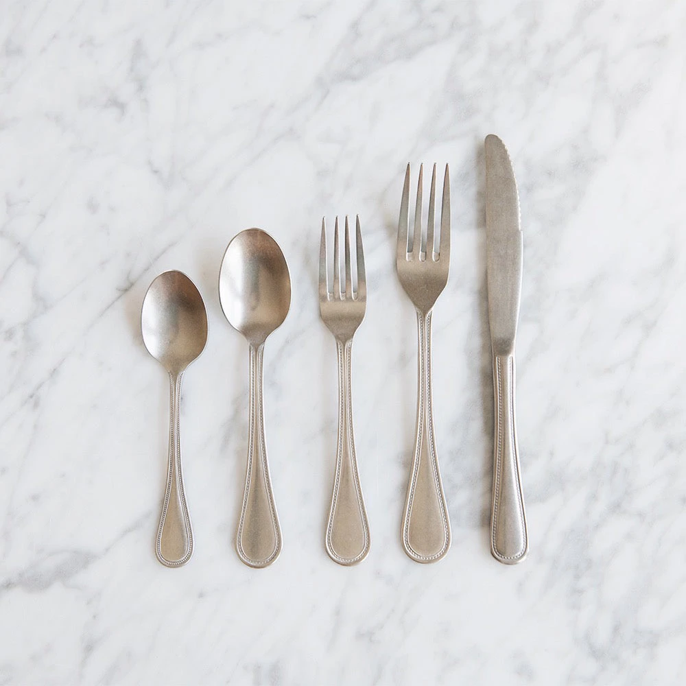 - set includes: fork, salad fork, knife, spoon, and dessert spoon
