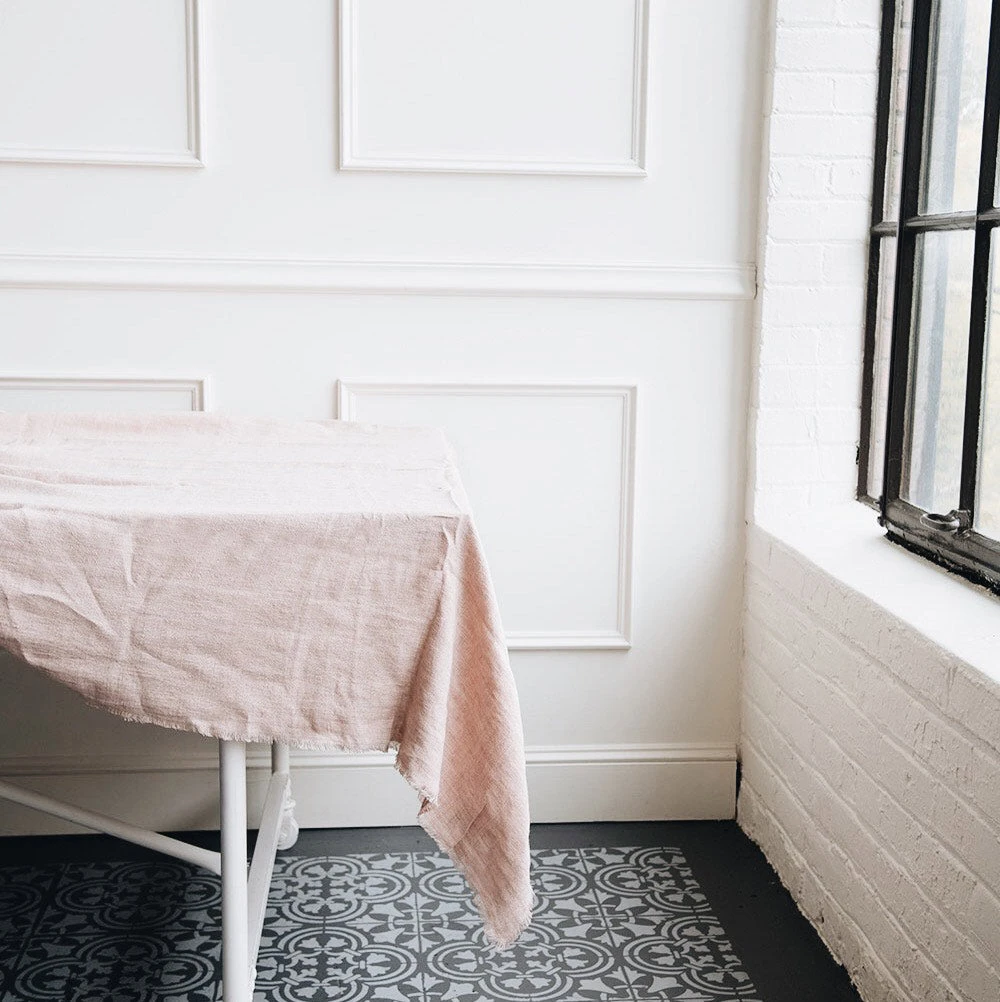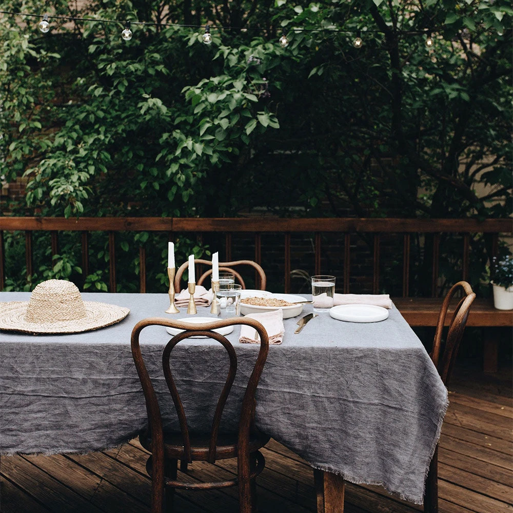 Ultra-soft stonewashed linen tablecloth finished with frayed edging.