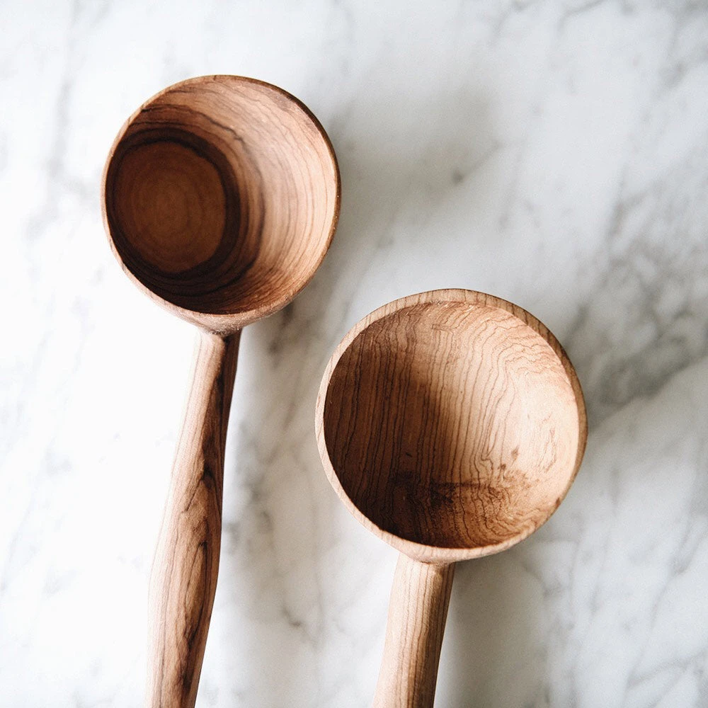 Our rustic wood soup ladle is handmade by artisans in Kenya from scraps of wild olive wood. Wild olive wood grows in protected areas in Kenya, and offers a stunning grain and durability.