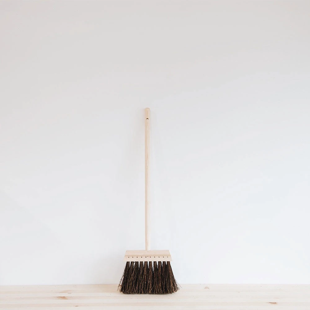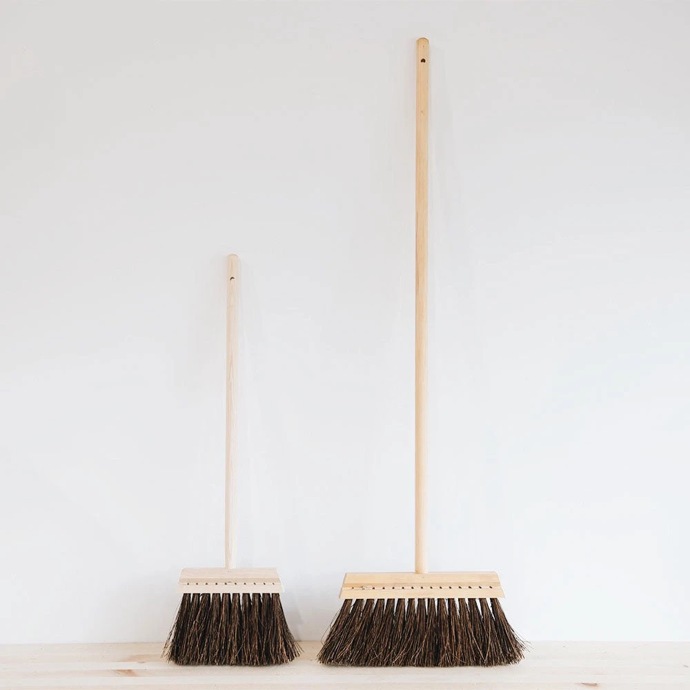 Stylish and practical wood broom. The brush is handmade with bristles that effectively sweep up crumbs and messes. The shorter handle allows for easy storage and is also ideal for having your little ones help to tackle some chores.
