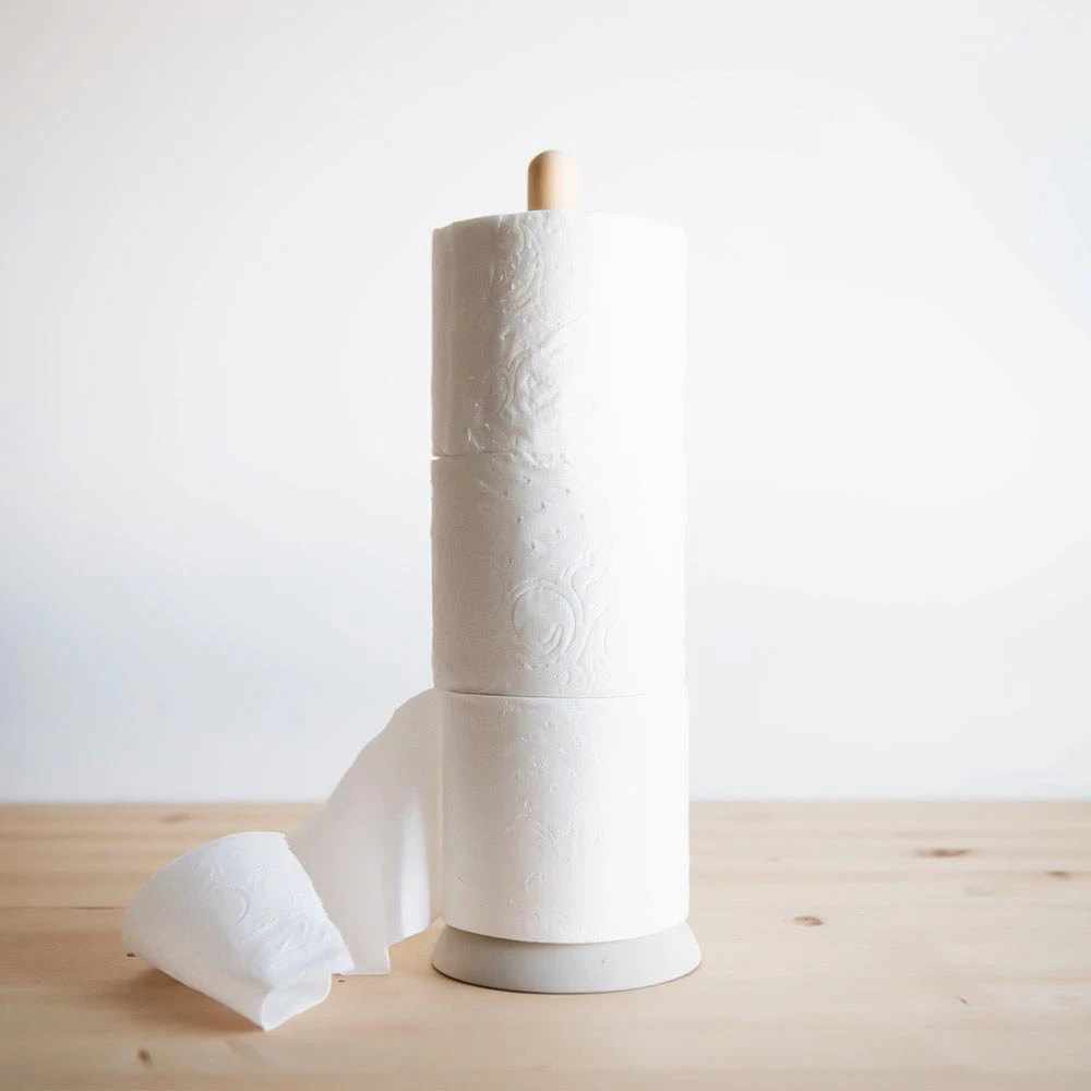 Beautiful and functional! Toilet paper holder with a pretty concrete base. By adding a small addition of polymer the concrete becomes elastic and pliable. It is not so soft that it can be bent, it’s still a stone material but has a pleasant feeling to it – warm, smooth, and comfortable. It contains no environmentally harmful substances. The bases are molded by hand in a small foundry outside of Stockholm. Â