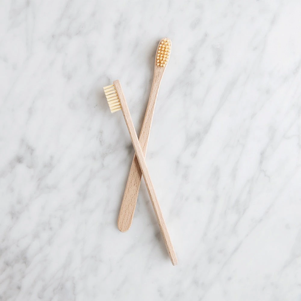 Luxurious wooden toothbrush in waxed beechwood. The brush consists of bristles that have been boiled several times to be sterilized. A plastic-free and compostable toothbrush that is nice to display in the bathroom.